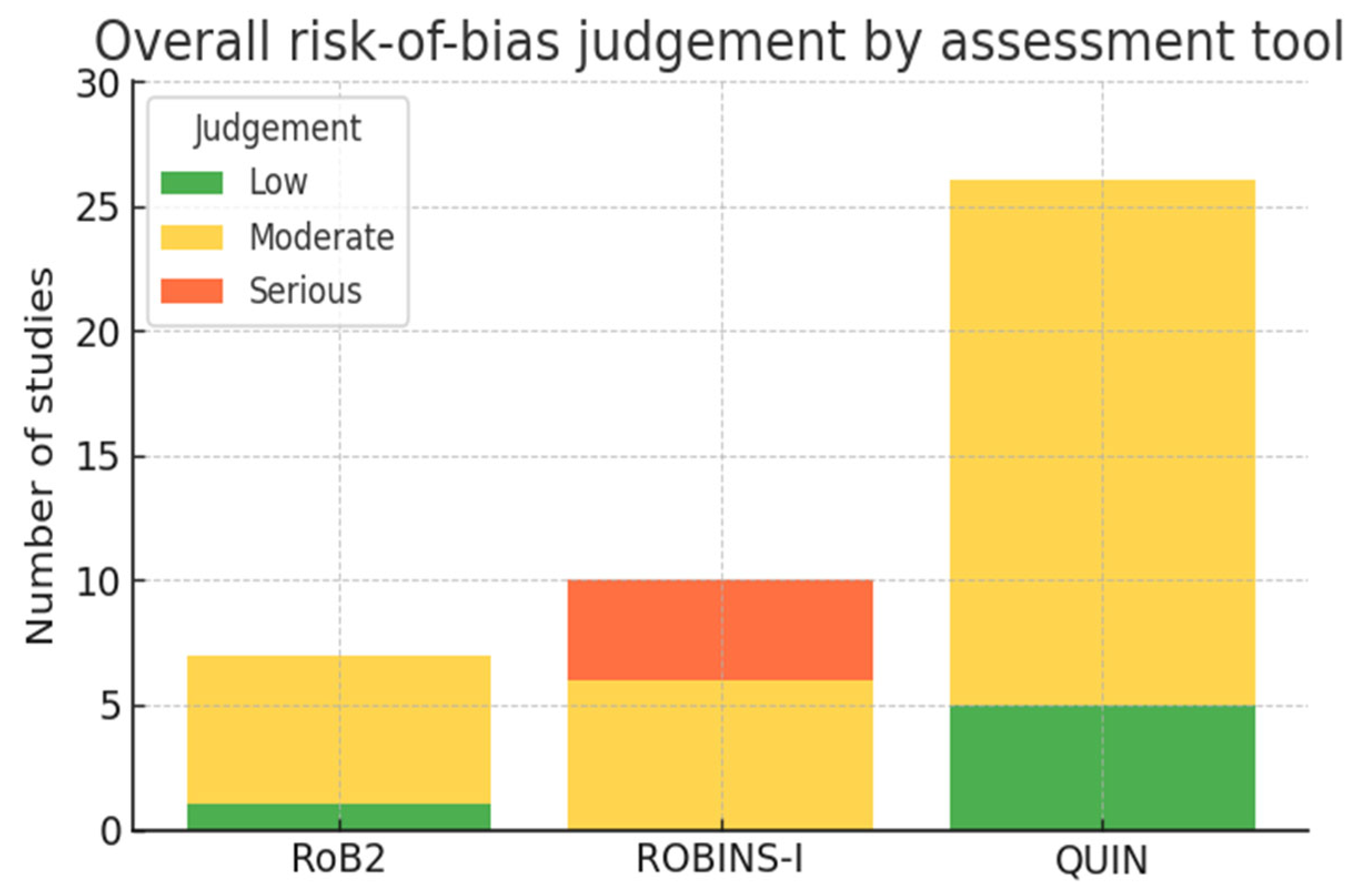 - Randomized controlled trials (RCTs, n = 7) were appraised with the Cochrane RoB 2 tool (five domains).