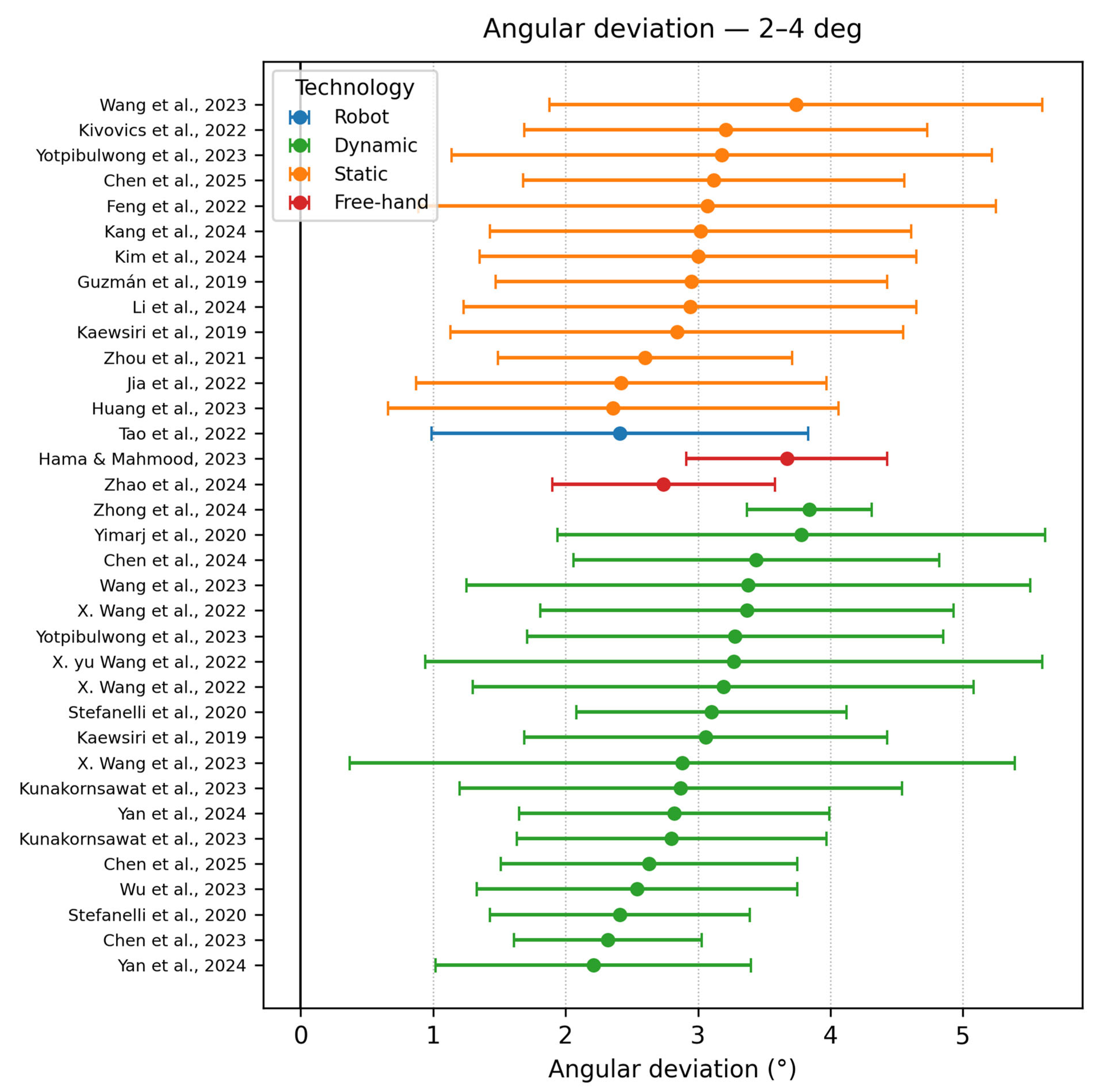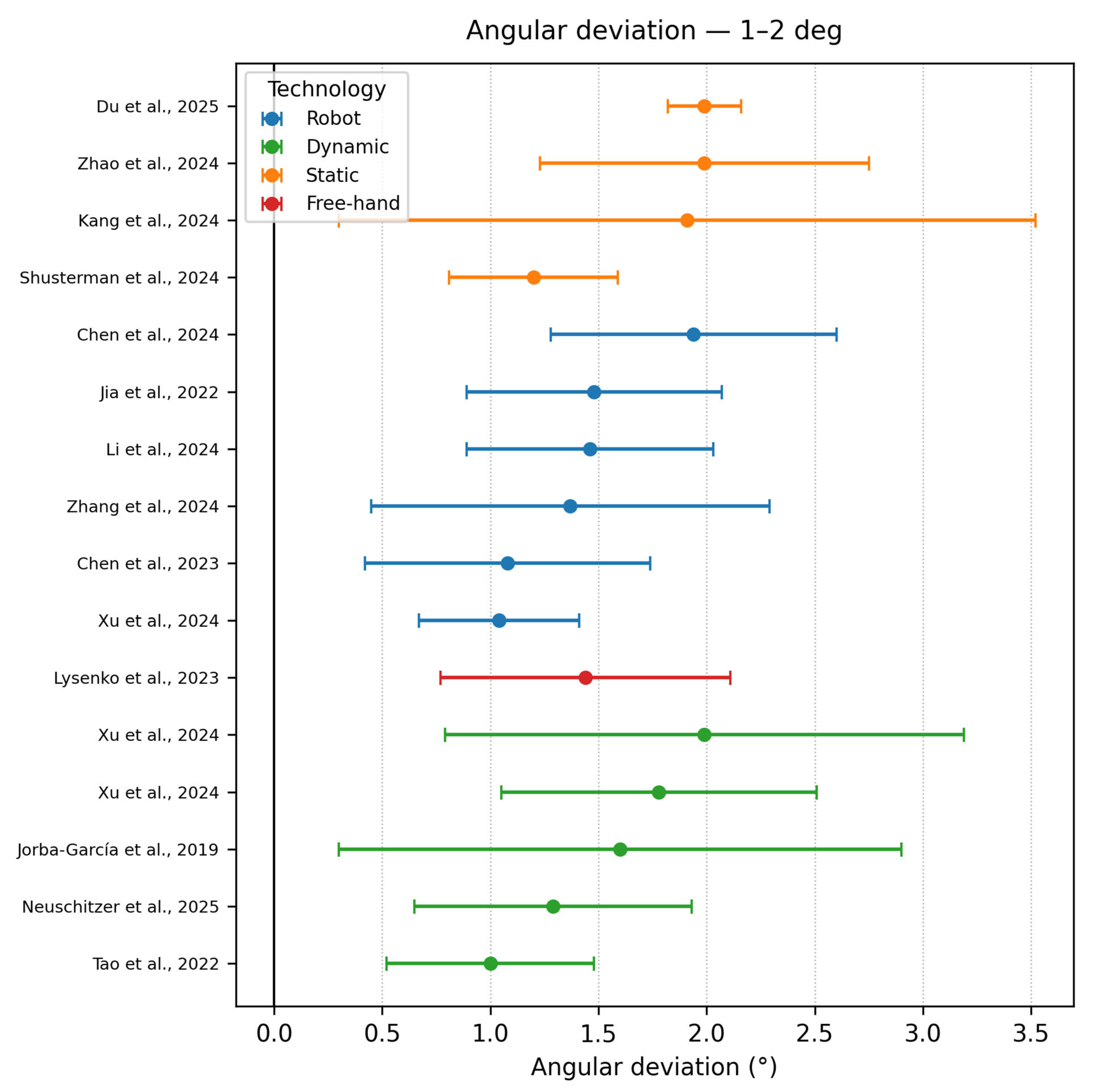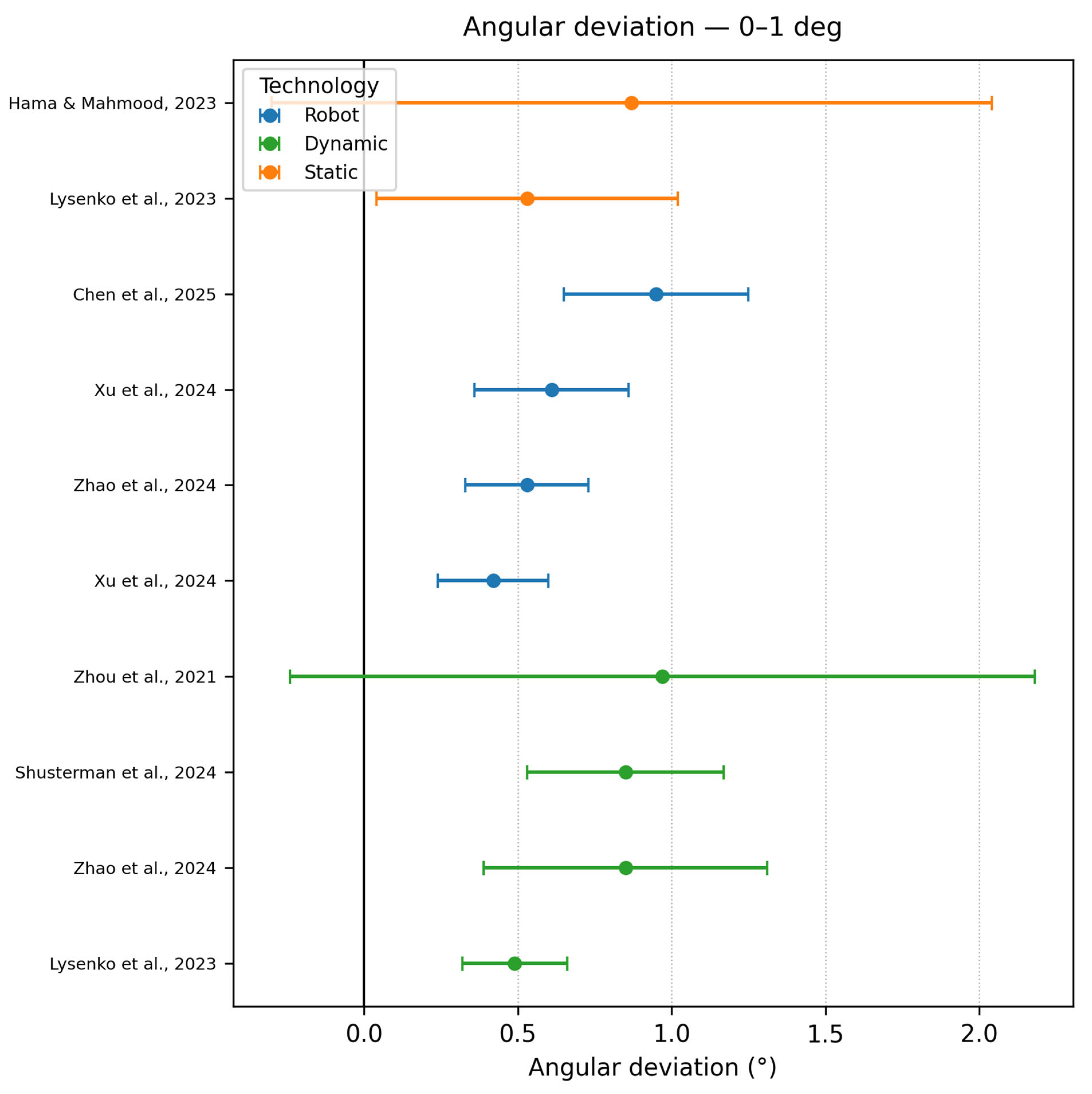 | Chen et al. [13] | In vitro study | RCAIS DCAIS | Remebot Yizhime | Conv | 2 | 80 | RCAIS −0.77 ± 0.34 | RCAIS −0.86 ± 0.36 | RCAIS −1.94 ± 0.66° |