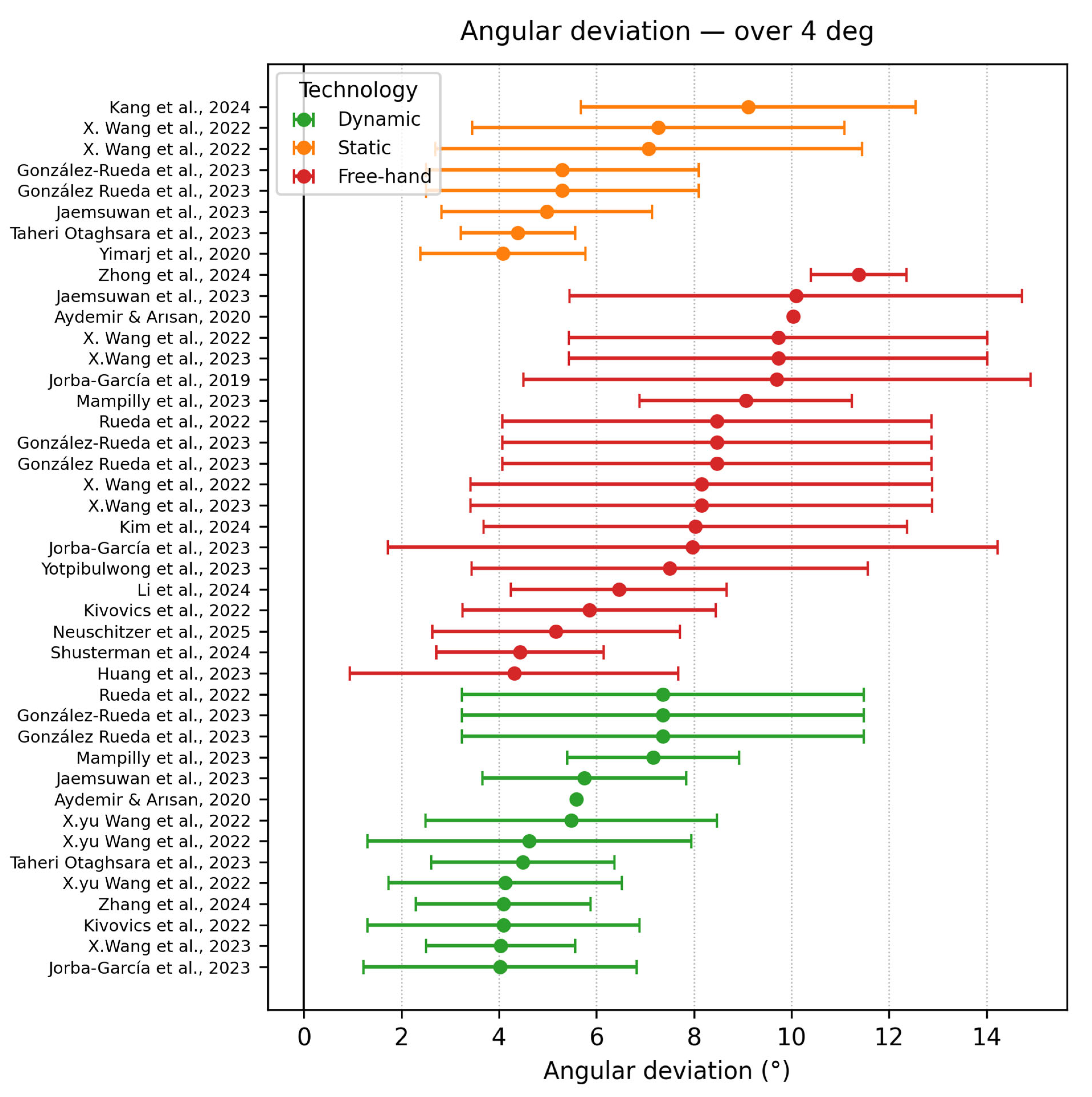 | Zhong et al. [30] | Case study | FREEHAND DCAIS | DHC DI2 (Dcarer Medical Technology Co., Ltd., Suzhou, China) | Conv | 2 | 20 | FH −2.08 ± 0.19 | FH −1.28 ± 0.14 | FH −11.38 ± 0.98° |
