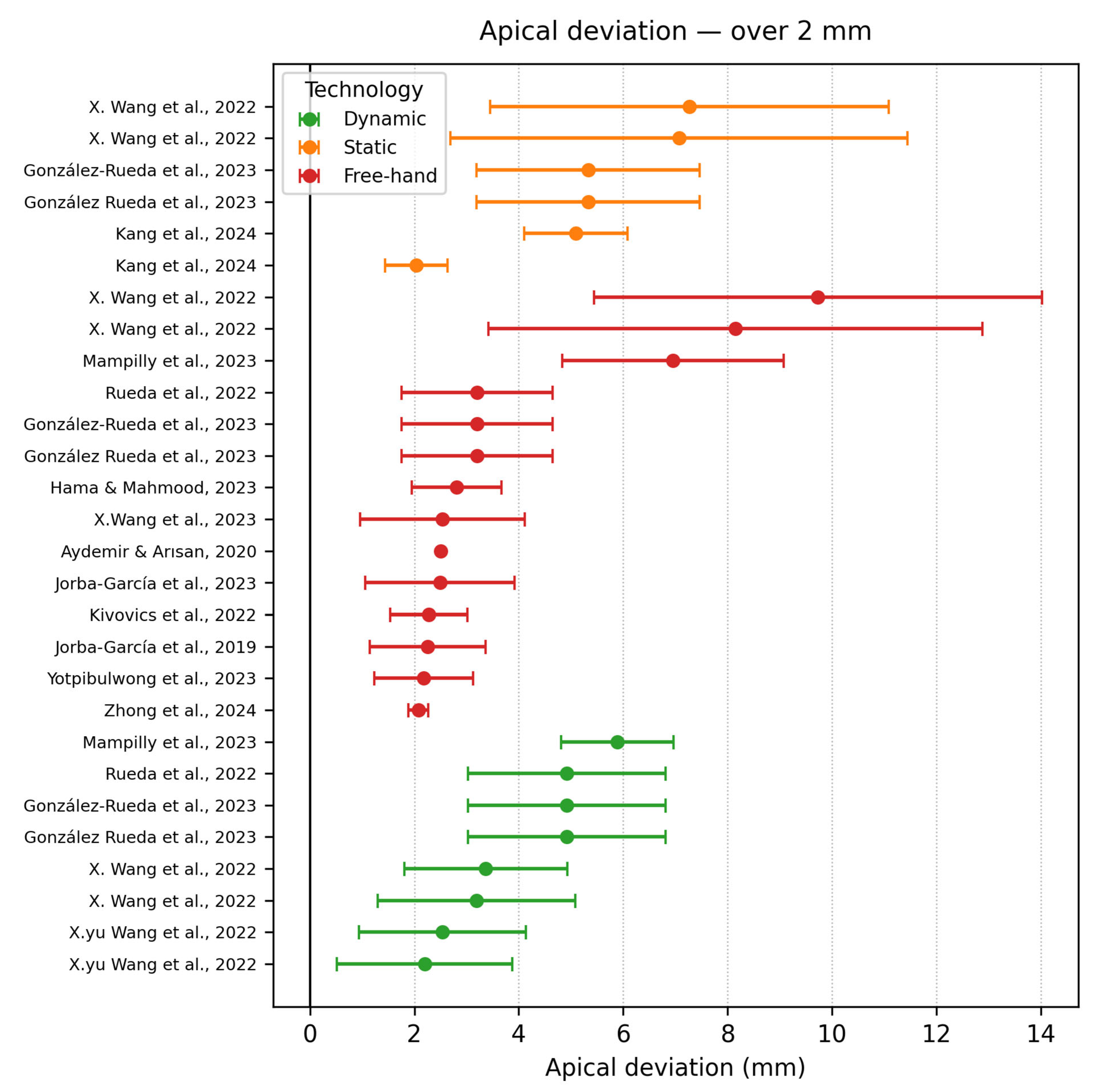 - Apical deviation ≥ 2 mm