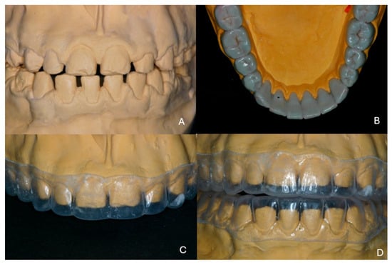 (A) Mounted study casts in the existing maximal intercuspation, (B) wax-up of the mandibular teeth, (C,D) thermoplastic sheets as copies of the wax-up.