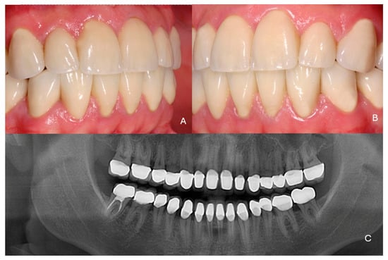 Clinical and radiographic examination at the 5-year recall. (A,B) Side views, (C) radiographic examination.