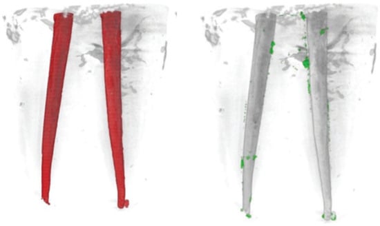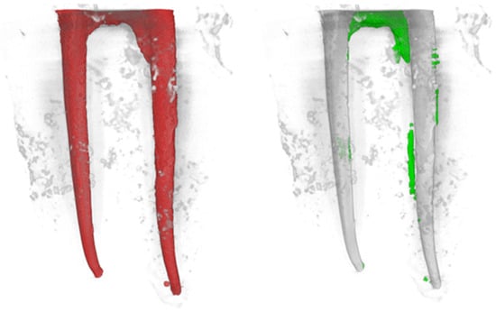 The merged pre-operative (left) and post-operative (right) nano-CT images of a sample from the Solite RE Black group are presented. In these images, the red areas (left) represent the obturated canal, the green areas (right) indicate the remaining filling material, while the gray areas represent the filling material that has been removed after retreatment.