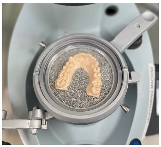 The ElectroDont device was programmed to follow a controlled thermal cycle consisting of a 10 min heating phase at 50 °C and a 10 min cooling phase. Aligner-0 was placed over the typodont teeth and connected to the power source according to the manufacturer’s instructions. During the heating phase, the softened wax accommodated the programmed extrusion of the upper left first molar. The aligner remained in place throughout the subsequent cooling phase to allow the wax to harden. The typodont was then immersed in cold water for two minutes to ensure complete hardening.