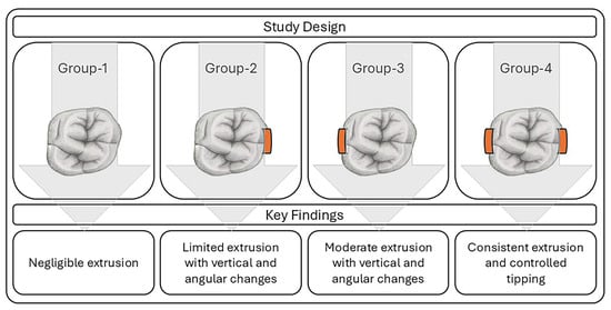This study initially evaluated how the extrusion of the upper first molar is influenced by the presence or absence of attachments at various sites. In Group 1, without attachments, extrusion at the mesiobuccal and distobuccal cusps measured approximately 0.27 mm and 0.25 mm, respectively; values that were statistically significant but not clinically meaningful due to the insufficient magnitude of movement. These findings align with those of Baik et al. [], who reported that attachments are essential for achieving effective extrusion, noting that in their study, the absence of attachments led to undesirable intrusion of the lower premolar []. Attachments can be classified as optimized or conventional. Optimized attachments are tailored based on tooth morphology and desired movement, while conventional designs include standard shapes such as rectangular or ellipsoidal forms with predefined parameters []. In the present study, an optimized attachment (4 mm wide, 3 mm high, and 2 mm deep) with a gingival bevel was used to facilitate extrusion movement.