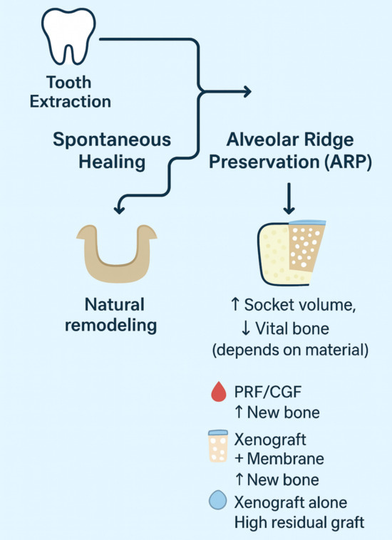 - Iocca, O.; Farcomeni, A.; Lopez, S.P.; Talib, H.S. Alveolar ridge preservation after tooth extraction: A Bayesian Network meta-analysis of grafting materials efficacy on prevention of bone height and width reduction. J. Clin. Periodontol. 2017, 44, 104–114. [Google Scholar] [CrossRef] [PubMed]