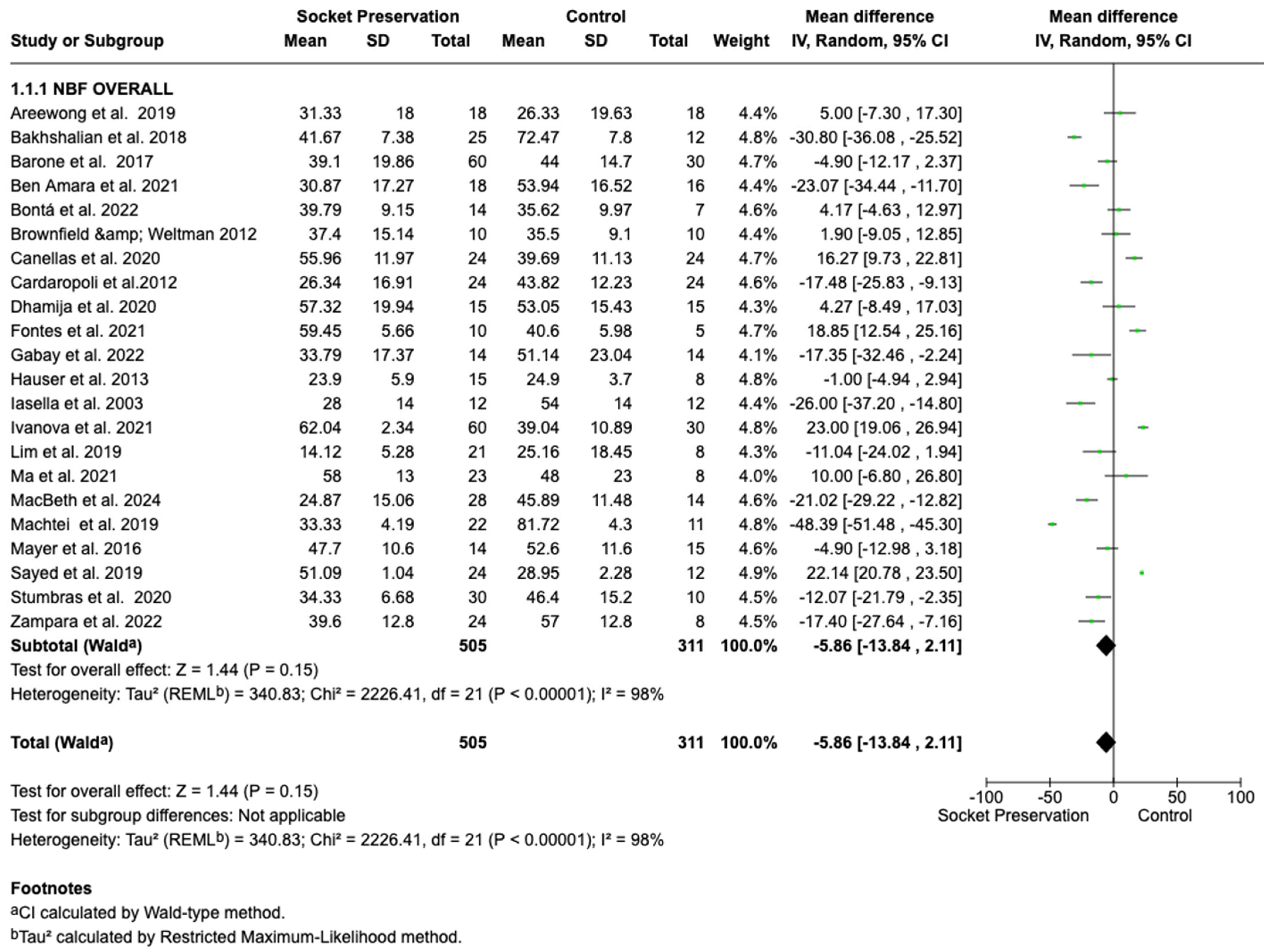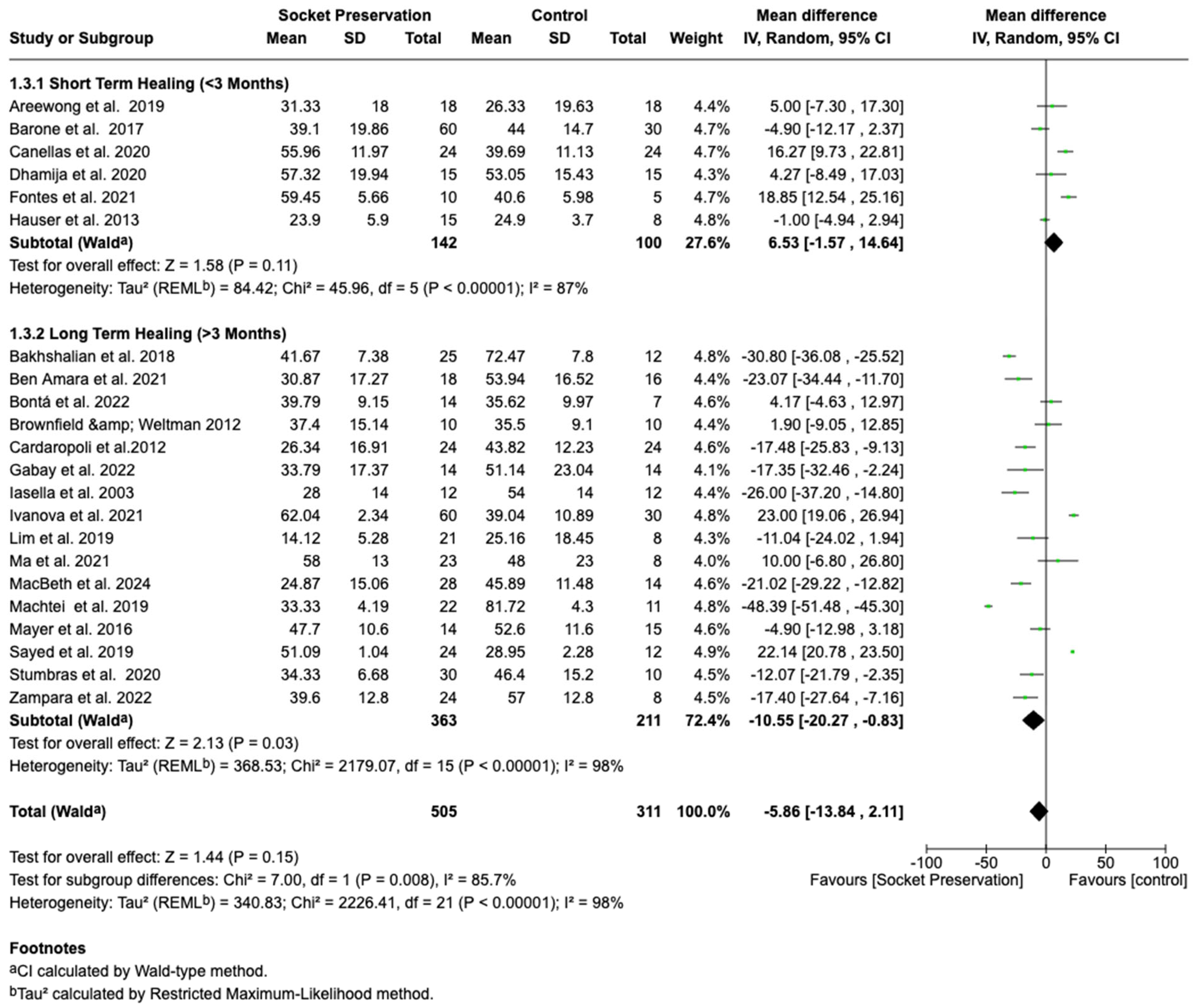 | Study (Author, Year) | Socket Preservation Mean (%) | Socket Preservation SD (%) | Socket Preservation N | Control Mean (%) | Control SD (%) | Control N |