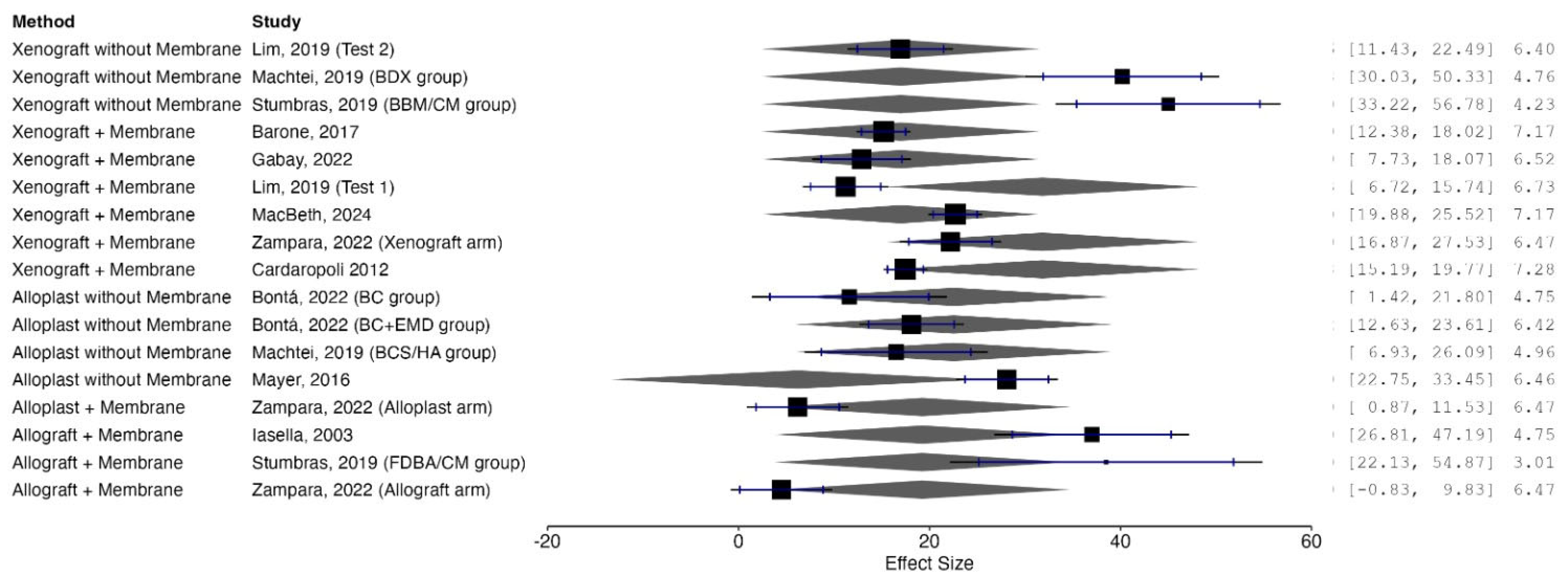 | Xenograft + Membrane | Barone, 2017 [19] | Porcine xenograft | Yes | Open | 15.2% ± 7.87% | 30 |