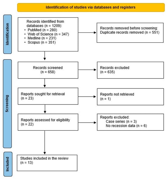 The preliminary search produced a total of 1209 records, comprising 280 papers from PubMed, 347 from Web of Science, 351 from Scopus, and 231 from Medline. Out of these, 551 papers were initially removed due to duplication. Subsequently, 658 records were evaluated based on their titles and abstracts, resulting in the elimination of 635 records. After excluding studies that did not meet the inclusion criteria, 23 papers were sought for retrieval, with one article that could not be retrieved. As a result, 22 full texts were assessed for eligibility. The final reviewed studies included in the present systematic review were 13 papers: seven were randomized clinical trials, one clinical study, three prospective clinical studies, one observational clinical study, and one split-mouth clinical study. The workflow for the systematic review is shown in Figure 1. The final included studies with their characteristics and outcomes are summarized in Table 2 and Table 3.