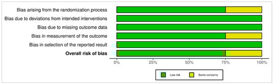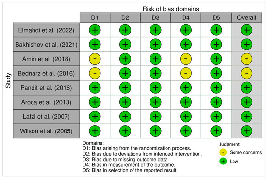 ROB 2 Traffic-light plots of risk-of-bias in randomized trials using the Cochrane Risk of Bias Tool. Risk of Bias Summary presents the review authors’ judgments regarding each domain of bias across included studies, allowing for a direct visual comparison between studies and bias categories. Each cell in the matrix is marked with a green, yellow, or red symbol, indicating low, moderate, or high risk of bias, respectively [2,17,19,20,21,22,23,24].
