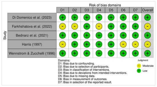 The ROBINS-I assessment indicated that most non-randomized studies had a low overall risk of bias. However, moderate risk was identified in Domain 1 (bias due to confounding) in two studies [16,25]. Additional moderate risk ratings were noted in Domain 2 (selection of participants) and Domain 4 (deviations from intended interventions) in one study [16], and in Domains 6 and 7 (measurement of outcomes and selection of reported result) in another [25]. The remaining domains in these studies were judged as low risk. Studies by Di Domenico et al. [15], Bednarz et al. [18], and Wennstrom and Zucchelli [26] were judged to have low risk of bias across all domains. In contrast, studies by Farkhshatova et al. [16] and Harris [25] presented moderate overall risk due to the absence of a control group, potential for confounding, and limited reporting on blinding.