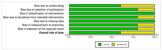 Figure 2 and Figure 3 display a summary of risk of bias, which presents the review authors’ judgments regarding each domain of bias across all included studies, allowing for a direct visual comparison between studies and bias categories. Each cell in the matrix is marked with a green, yellow, or red symbol, indicating low, moderate, or high risk of bias, respectively.