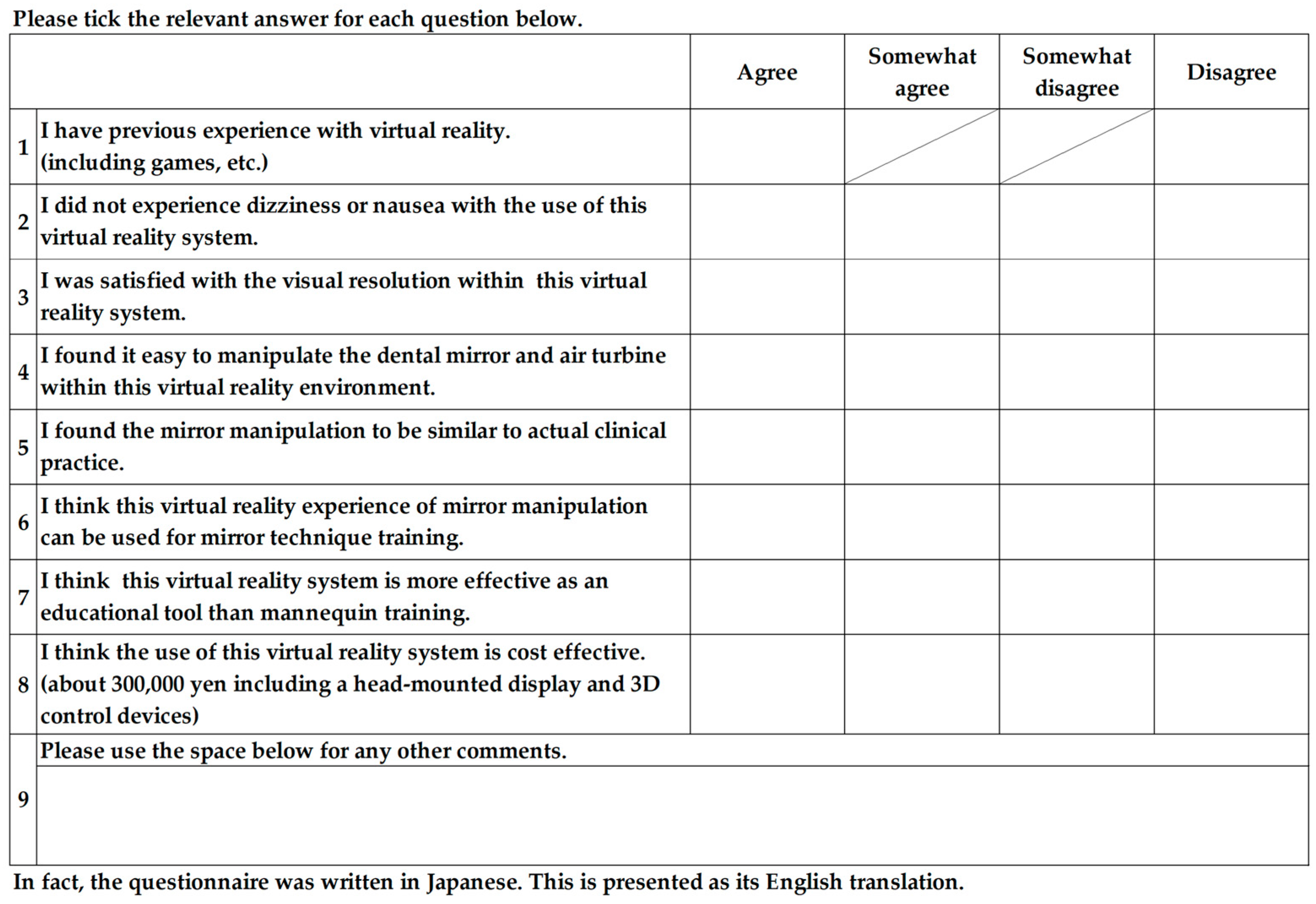 APA StyleNagasawa, R., Sato, T., Isogai, Y., Yamada, Y., Imamura, T., & Fujii, N. (2025). New Virtual Reality Educational Tool for Evaluating Dental Mirror Technique Skills: A Pilot Study. Dentistry Journal, 13(12), 566. https://doi.org/10.3390/dj13120566