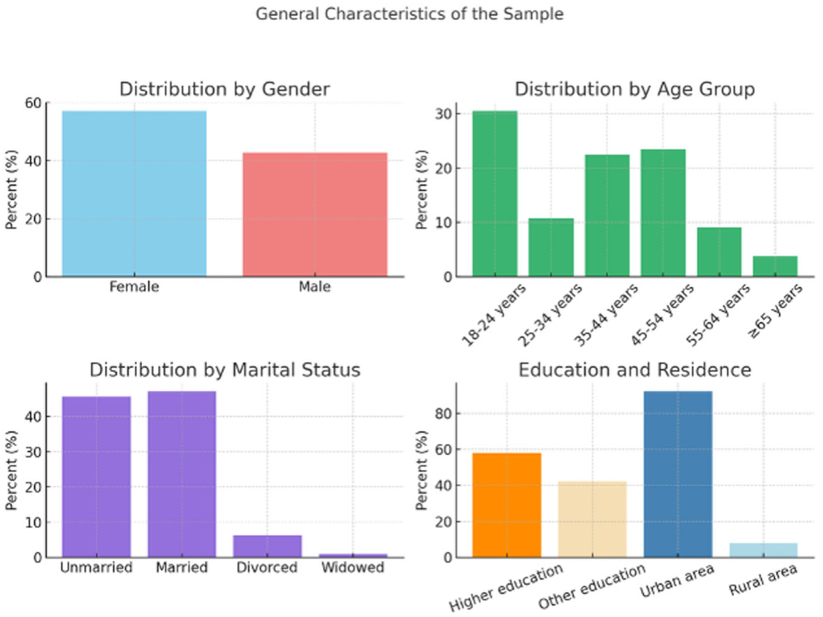 Table 1 provides an overview of the socio-demographic distribution of the sample, including variables such as gender, age, place of residence, level of education and marital status. The sample comprises a majority of female respondents and a significant proportion of young people aged 18–24. The majority of participants come from urban areas (92.2%), which is relevant for the present study, given that these areas offer easier access to information and digital technologies. The level of education is also high: more than half of the respondents having received higher education, suggesting a high degree of digital literacy and a greater receptiveness to technological innovations in healthcare. About 47% of participants are married, a social characteristic which may influence attitudes towards modern dental treatments through relational stability and shared decision-making within the family unit.