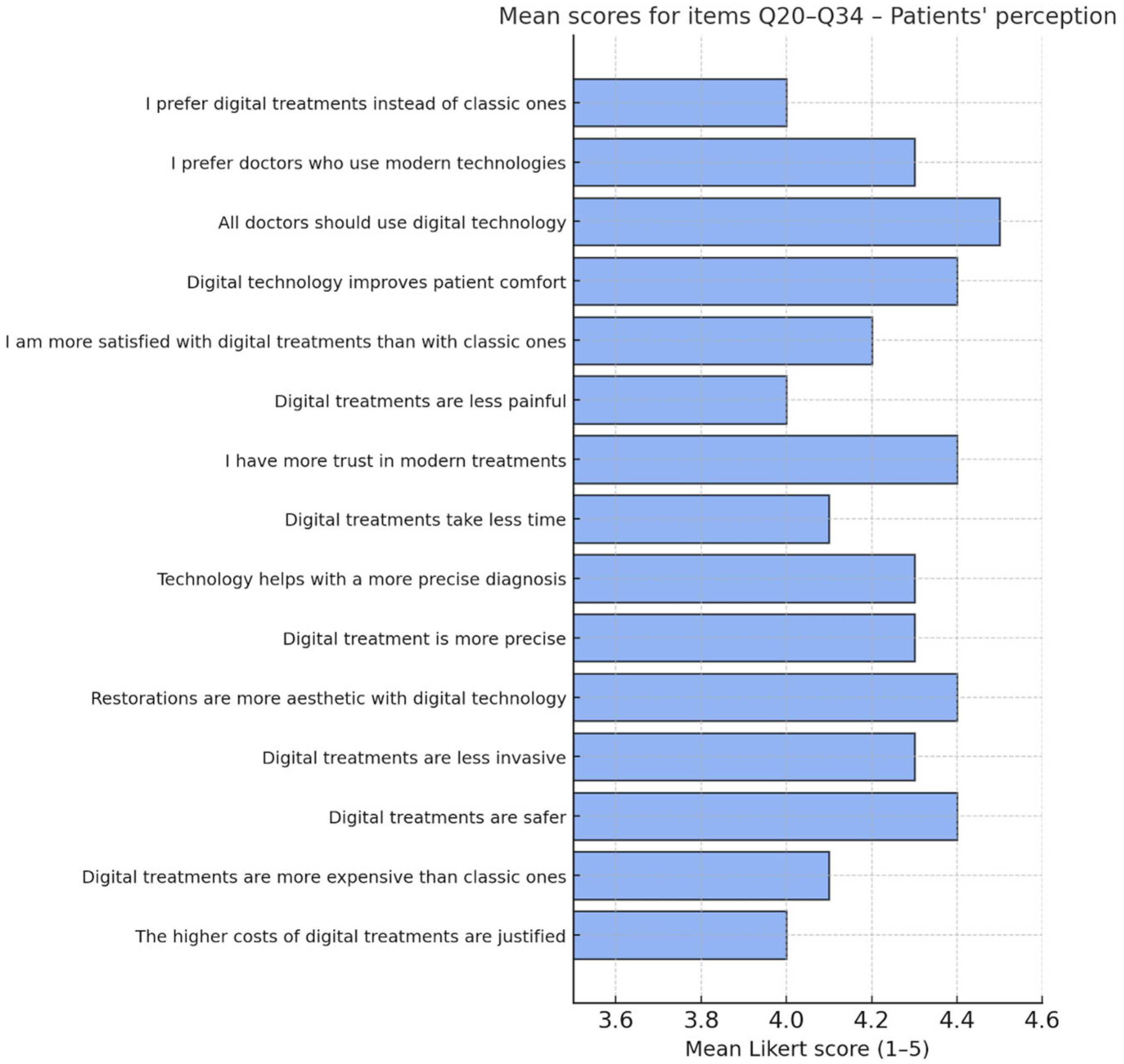 Table 2 presents the mean scores, standard deviations and medians for the scaled items Q20–Q34. The high values for most of the items indicate an increased level of acceptance and confidence in digital technologies by patients. The most valued aspects are patient comfort, aesthetics of restorations and the perceived safety of treatment. In contrast, the cost-related scores reflect an ambivalent perception, with patients recognising higher costs, but also expressing a relatively good acceptance of these costs if justified by quality.