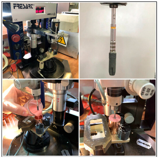 Each sample consisted of an internally connected titanium dental implant (4.2 mm diameter) fixed in a copper metal cylinder. The cylinder was filled with a self-curing polymethyl methacrylate (PMMA) resin, commonly used in in vitro implant studies due to its dimensional stability, although its elastic modulus is lower than that of human cortical bone. All implants were positioned vertically and parallel using a parallelizer to ensure uniform orientation with respect to a central reference plane. This procedure ensured the correct alignment of the crowns during subsequent tests (Figure 1).