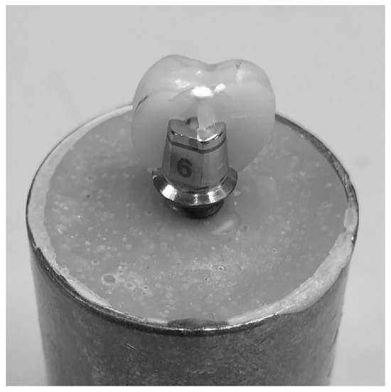 In accordance with the manufacturer’s recommendations, acrylic resin was poured before inserting each implant to ensure adequate adhesion and stability within the metal cylinder. In accordance with the manufacturer’s instructions, a straight titanium abutment (6 mm in diameter and 2 mm in transgingival height) was screwed onto each implant with a torque of 25 Ncm using a torque wrench to ensure stable fixation.