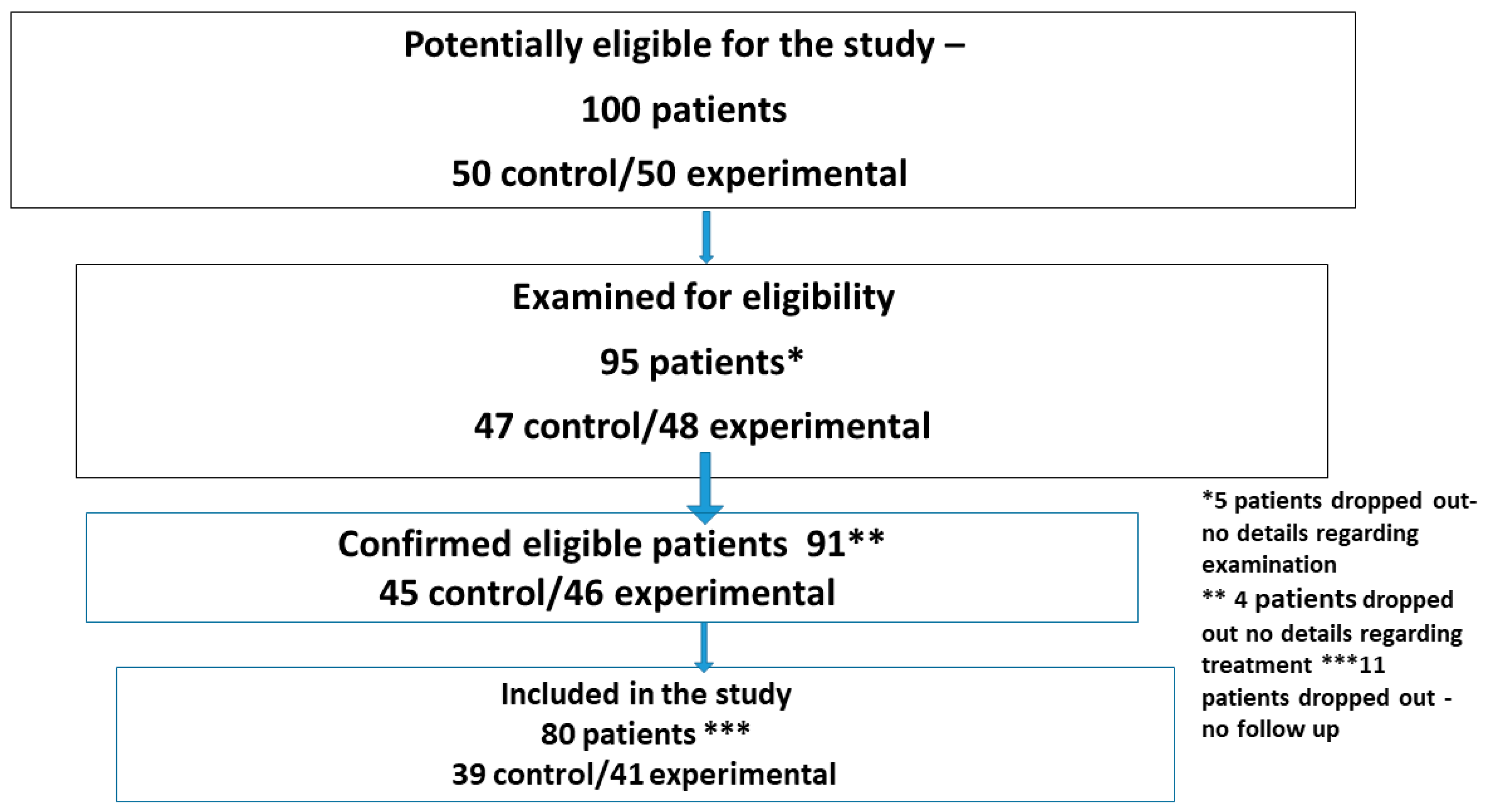 A total of 100 patients were initially considered for inclusion in the study. Of these, 95 were assessed for eligibility, 91 met the inclusion criteria, and 80 completed follow-ups and were included in the final analysis (