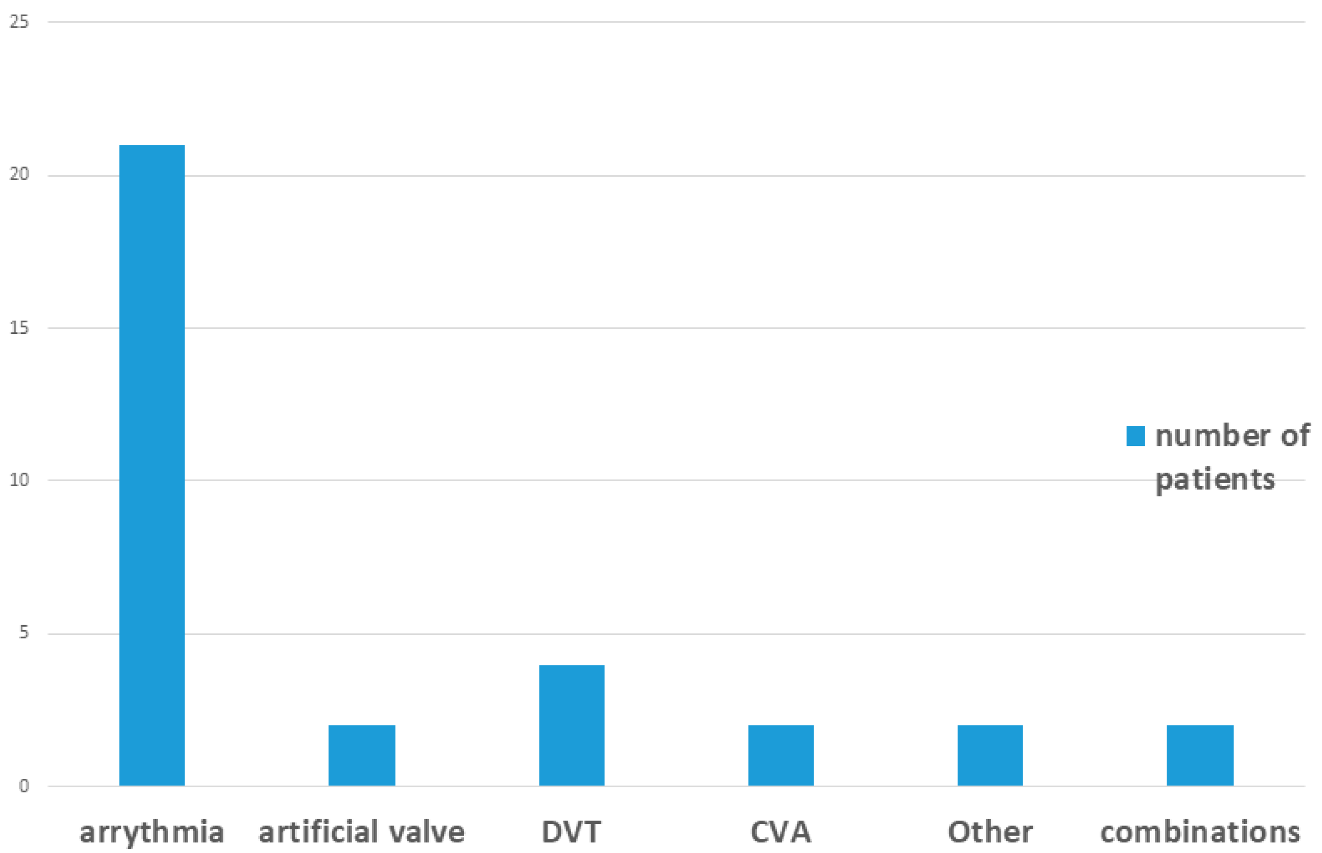 Among patients receiving DOAC therapy, 38 were treated with apixaban (Eliquis