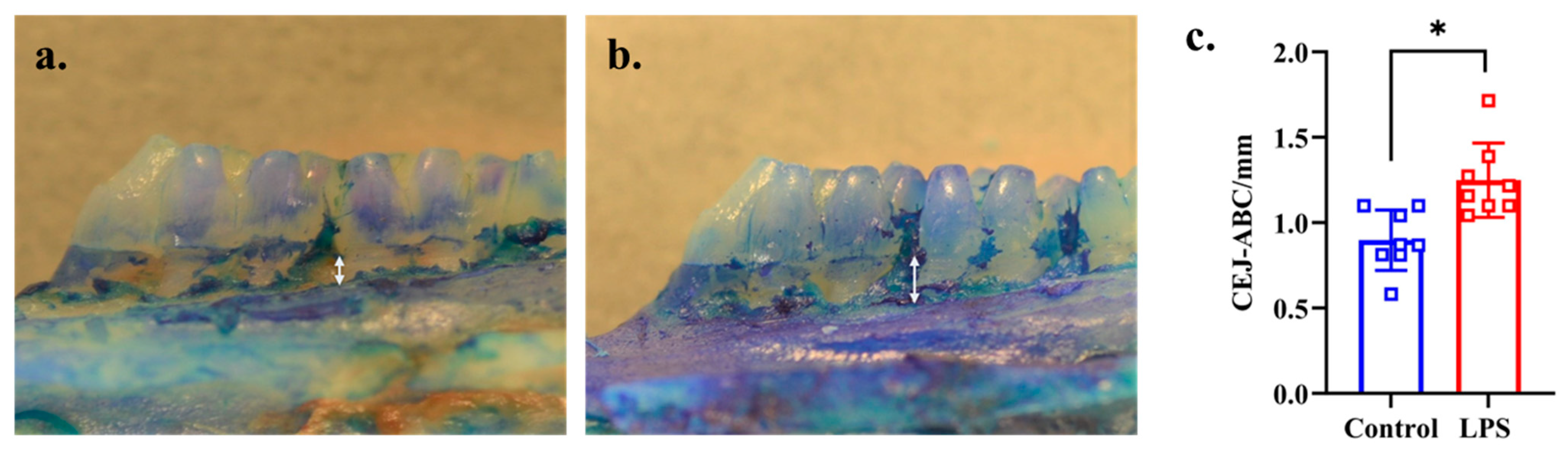 - Leira, Y.; Iglesias-Rey, R.; Gómez-Lado, N.; Aguiar, P.; Sobrino, T.; D’Aiuto, F.; Castillo, J.; Blanco, J.; Campos, F. Periodontitis and vascular inflammatory biomarkers: An experimental in vivo study in rats. Odontology 2020, 108, 202–212. [Google Scholar] [CrossRef]