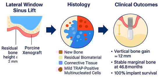 Spînu, A.; Manole, F.; Burcea, A.; Albu, C.-C.; Mărcuț, L.-F.; Brata, R.D.; Manole, A.; Bogdan-Andreescu, C.F. Sinus Lift with Collagenated Porcine Xenograft in Severely Atrophic Posterior Maxillae: Case Series with Histologic Correlation and Long-Term Outcomes. Dent. J. 2025, 13, 584. https://doi.org/10.3390/dj13120584
