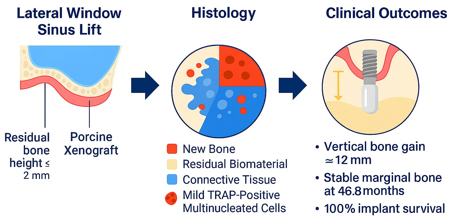 Spînu A, Manole F, Burcea A, Albu C-C, Mărcuț L-F, Brata RD, Manole A, Bogdan-Andreescu CF. Sinus Lift with Collagenated Porcine Xenograft in Severely Atrophic Posterior Maxillae: Case Series with Histologic Correlation and Long-Term Outcomes. Dentistry Journal. 2025; 13(12):584. https://doi.org/10.3390/dj13120584