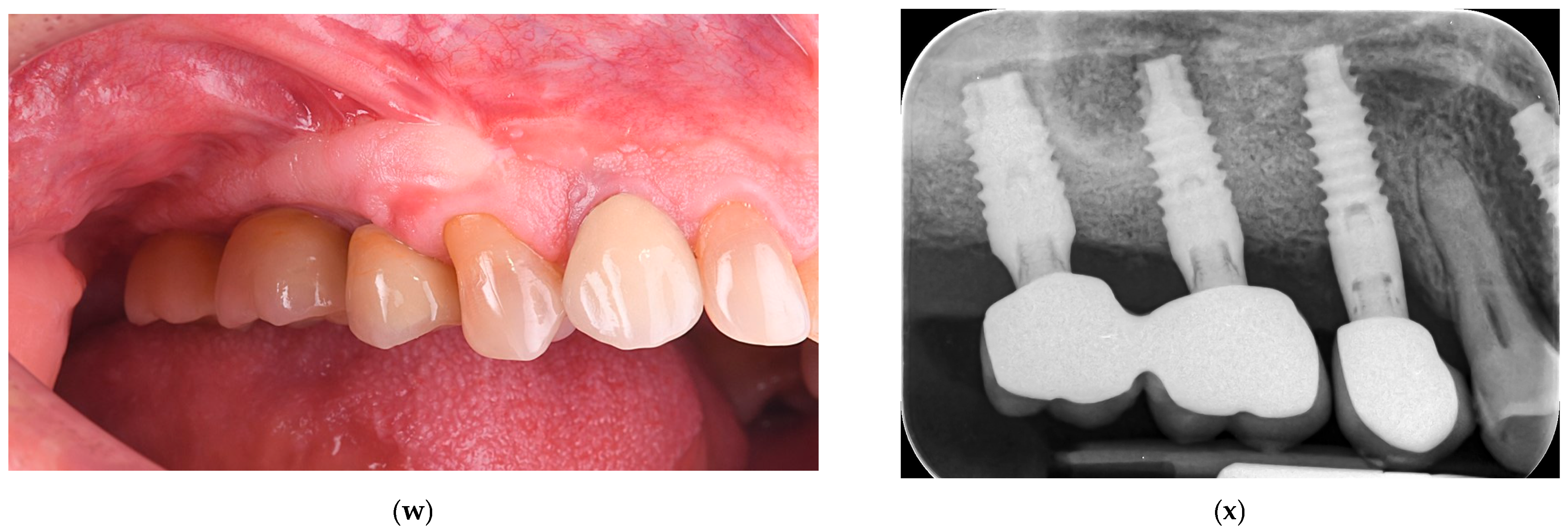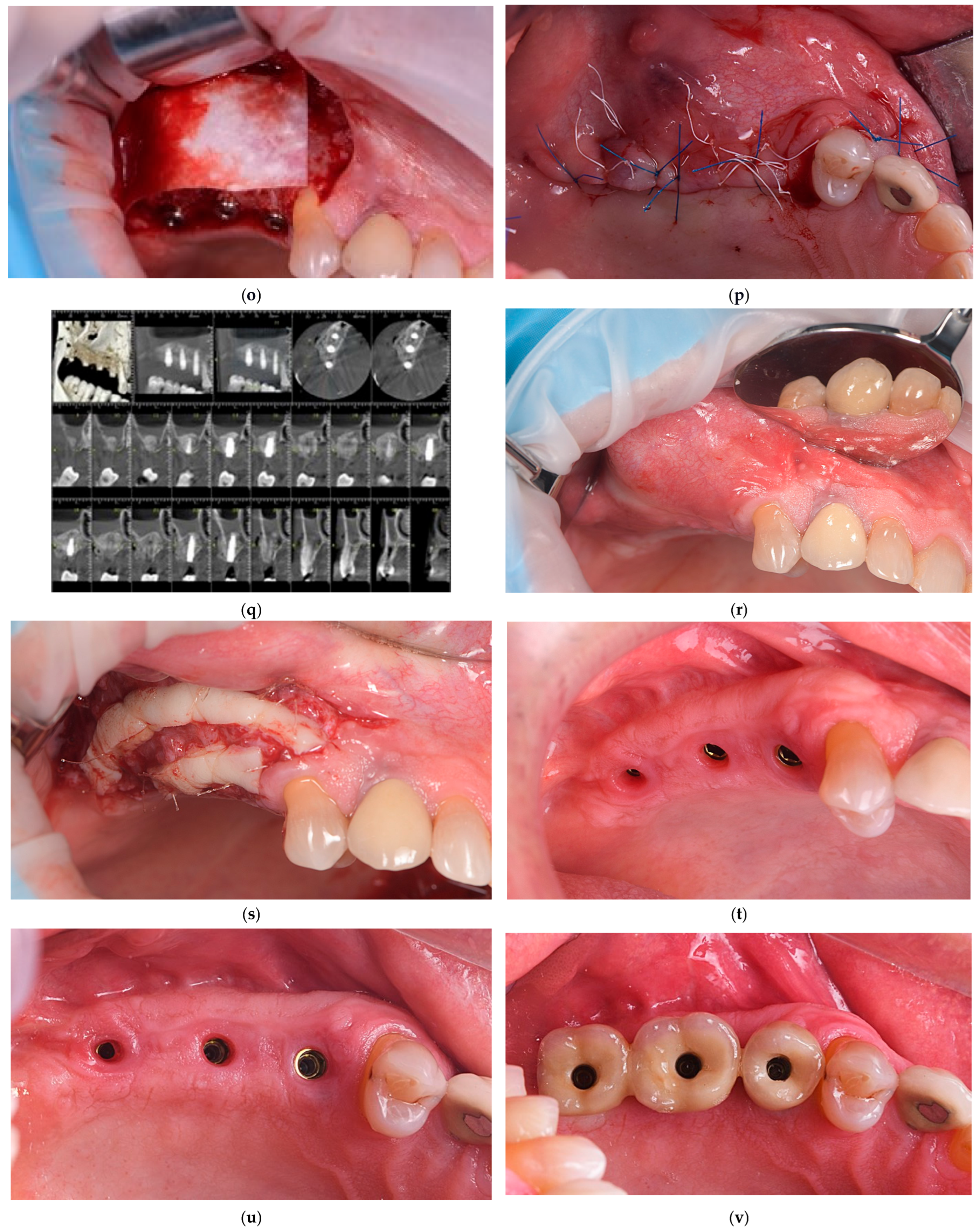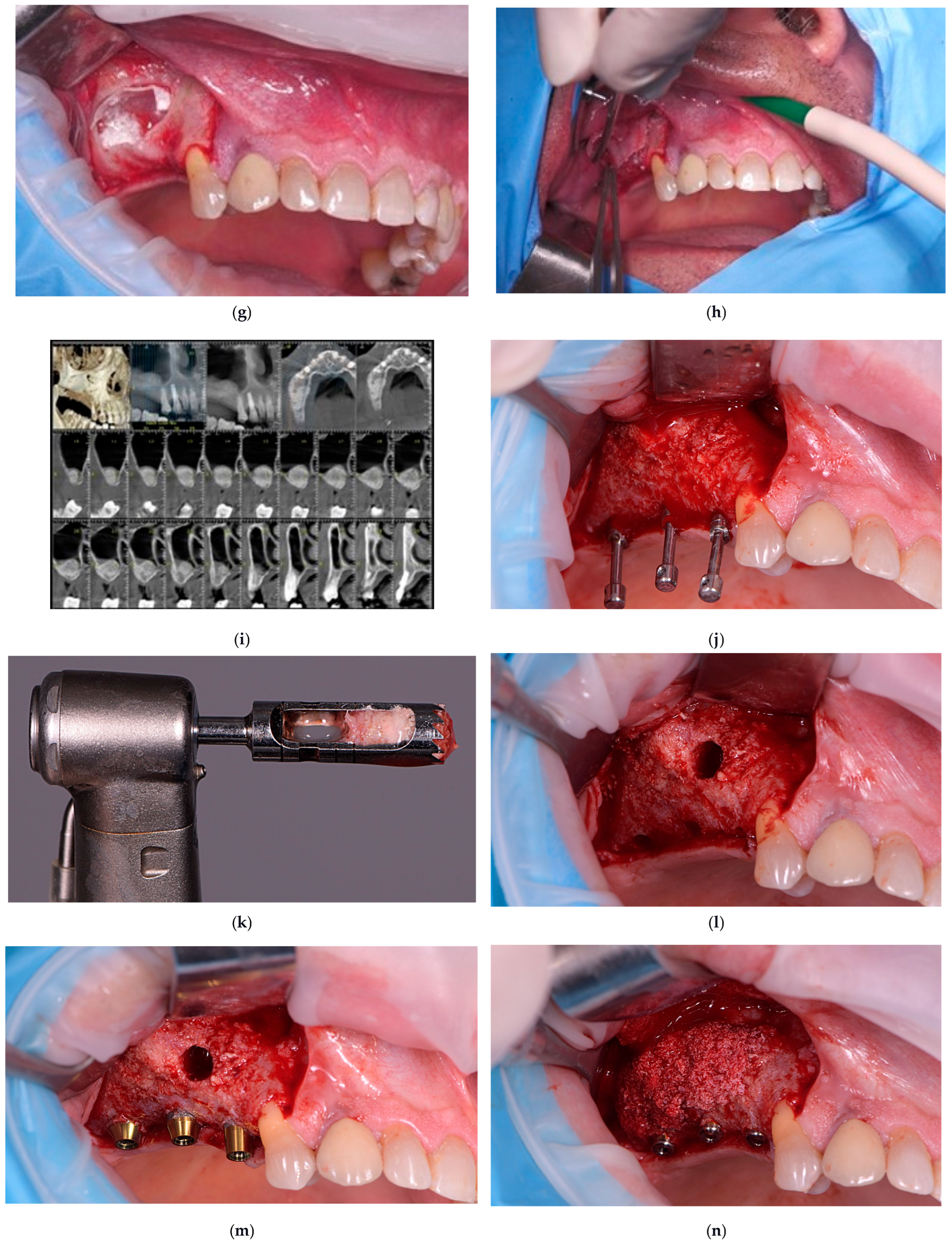 - Huang, L.R.; Zhong, Y.J.; Zhang, X.Q.; Feng, Z.R.; Lai, Y.C.; Wu, H.K.; Mo, A.C. Comparative evaluation of allograft particulate bone and cortical bone blocks combined with xenograft bone for labial bone defects in the aesthetic zone: A prospective cohort study. BMC Oral Health 2025, 25, 137. [Google Scholar] [CrossRef]