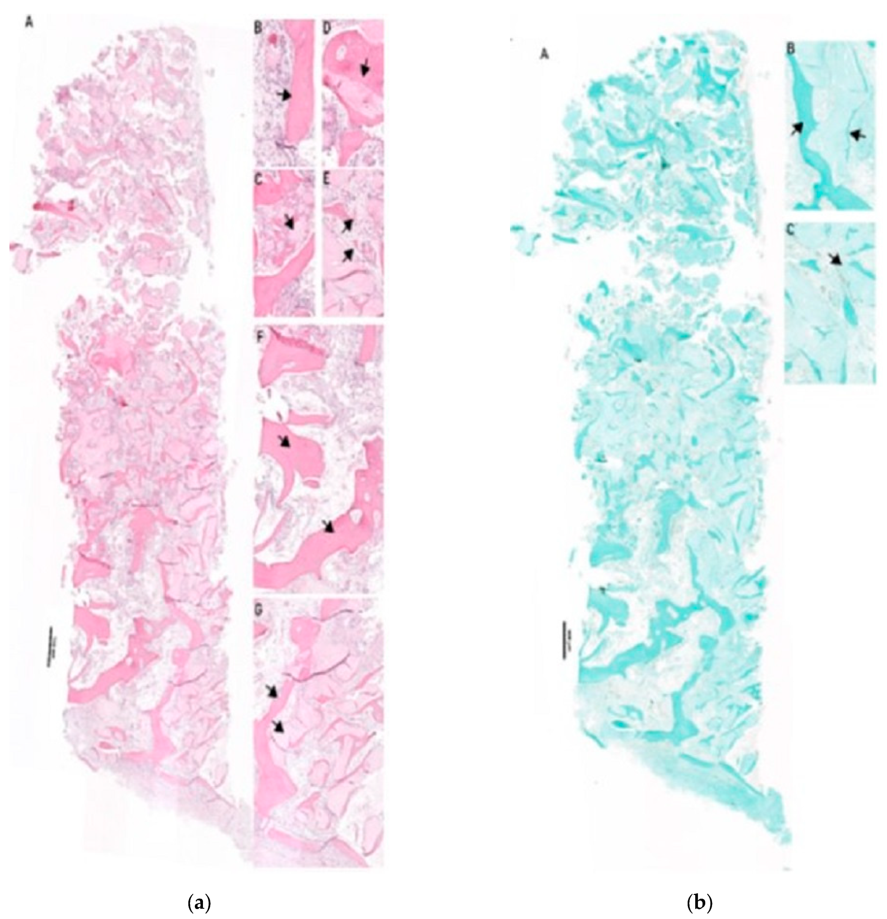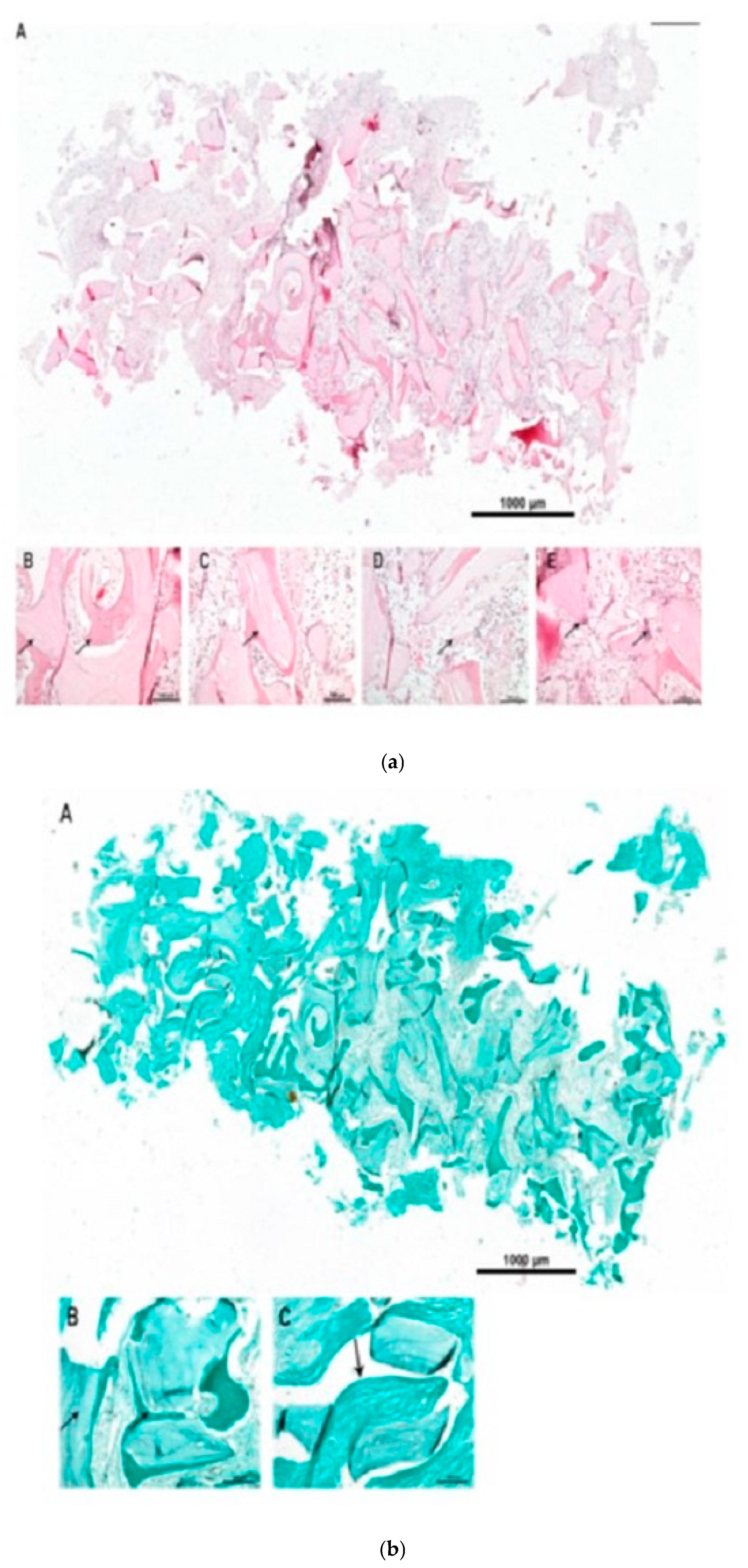 - Jo, S.H.; Kim, Y.K.; Choi, Y.H. Histological Evaluation of the Healing Process of Various Bone Graft Materials after Engraftment into the Human Body. Materials 2018, 11, 714. [Google Scholar] [CrossRef] [PubMed]