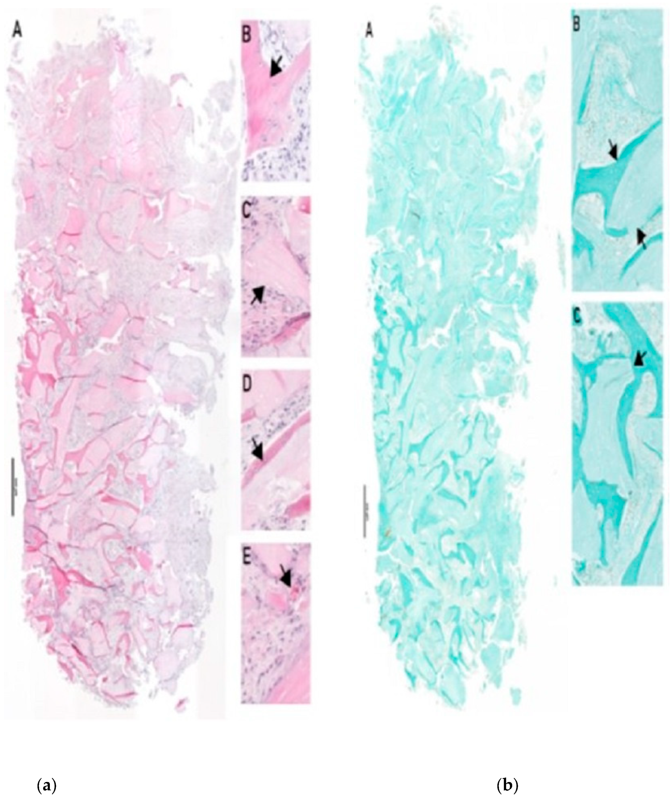 - Savadori, P.; Del Fabbro, M.; Sora, V.M.; Giardino, L.; Generali, L.; Kondic, D.; Santoro, F. Histological and Histomorphometric Evaluation of RegenerOss®: A Porcine-Derived Bone Substitute for Guided Bone Regeneration. J. Compos. Sci. 2025, 9, 245. [Google Scholar] [CrossRef]