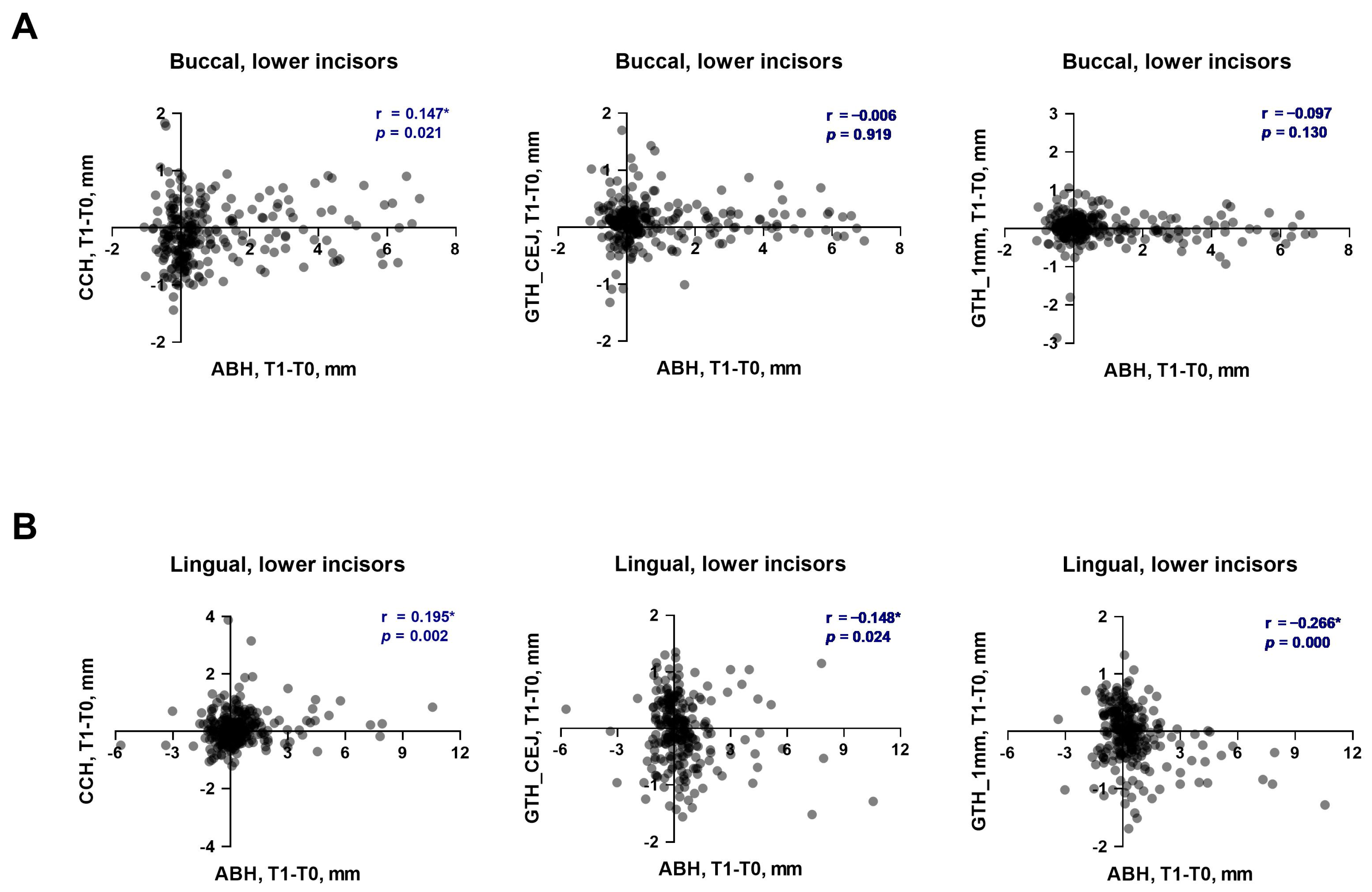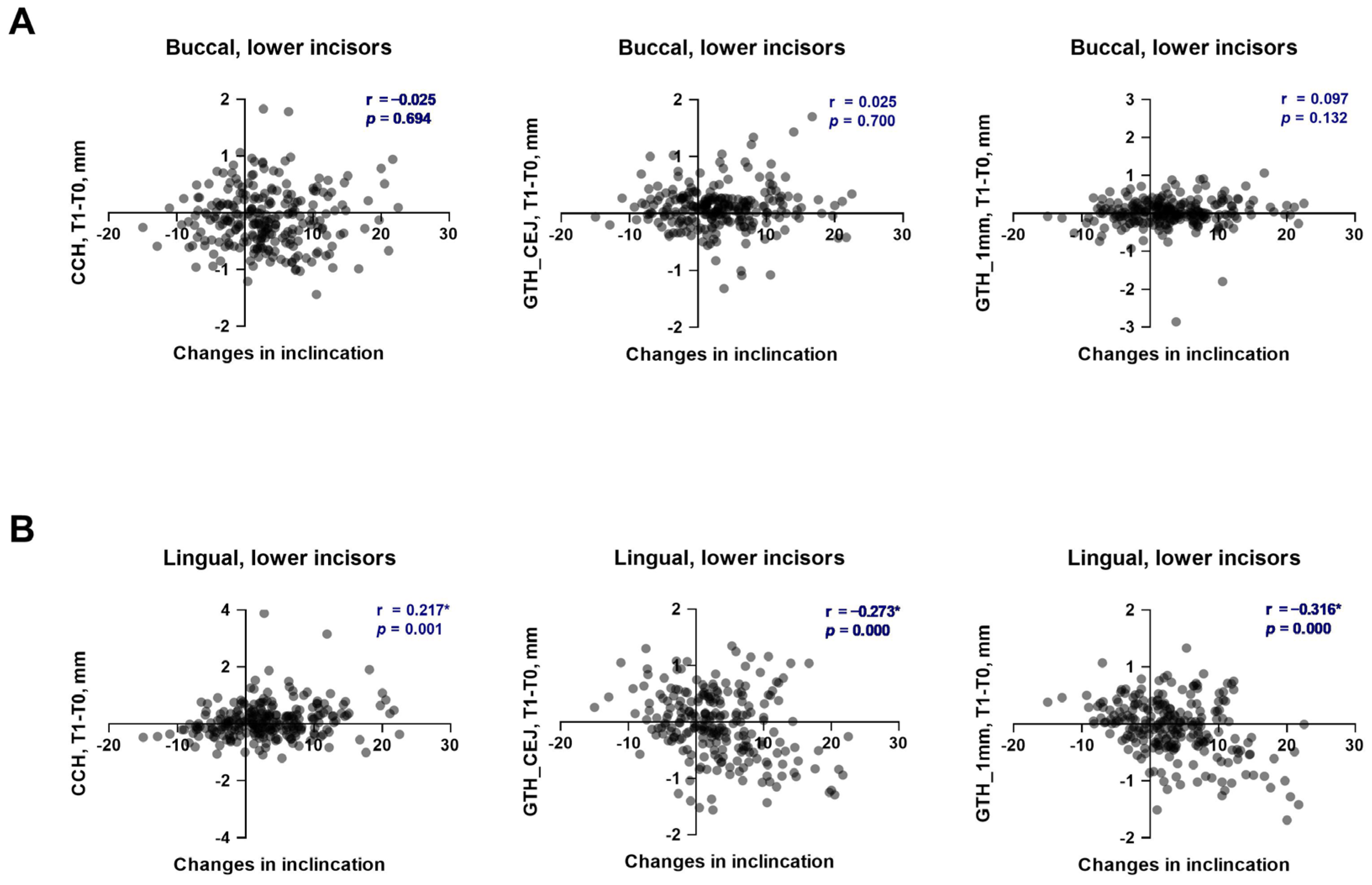 - Lee, J.B.; Baek, S.J.; Kim, M.; Pang, E.K. Correlation analysis of gingival recession after orthodontic treatment in the anterior region: An evaluation of soft and hard tissues. J. Periodontal Implant. Sci. 2020, 50, 146–158. [Google Scholar] [CrossRef]