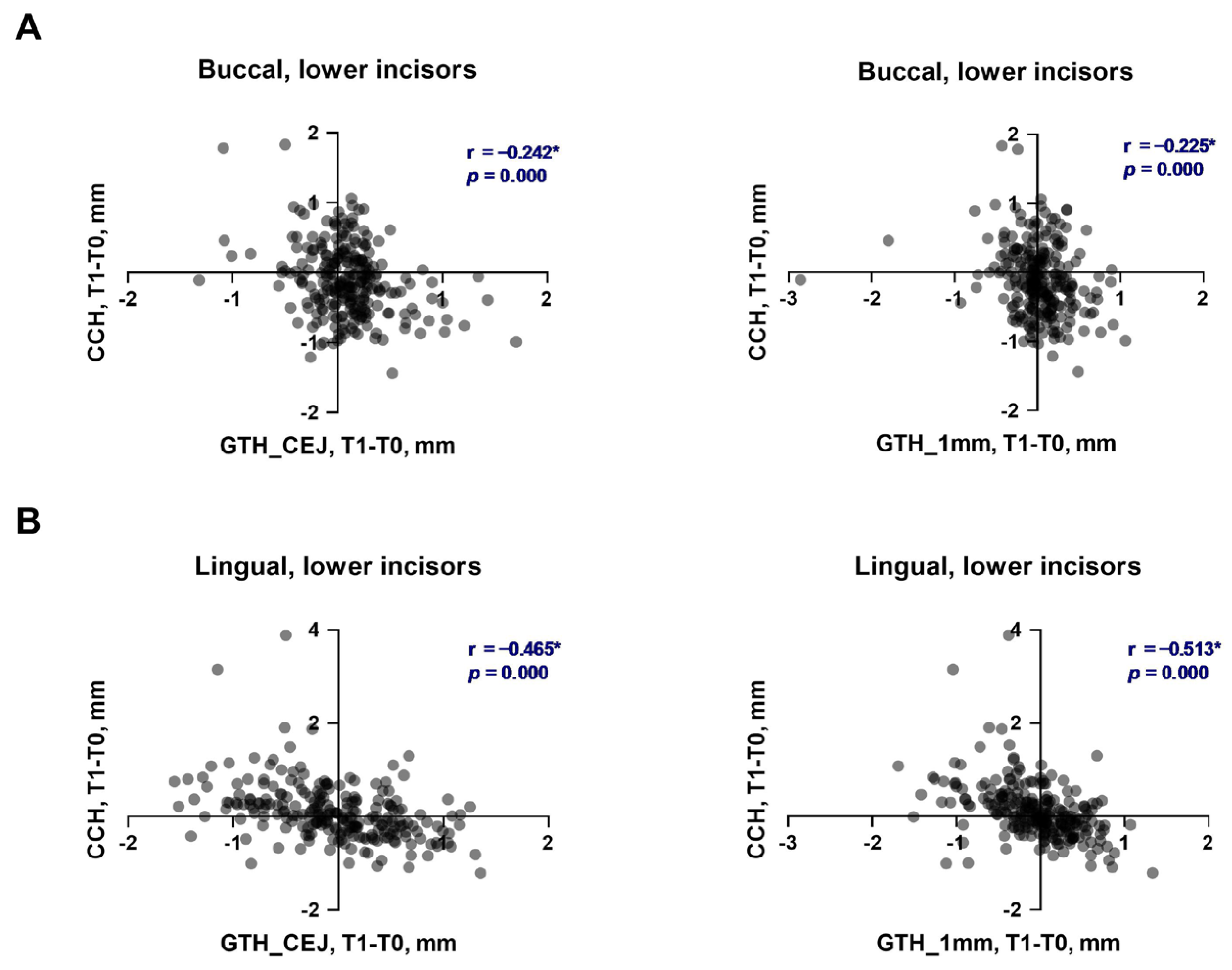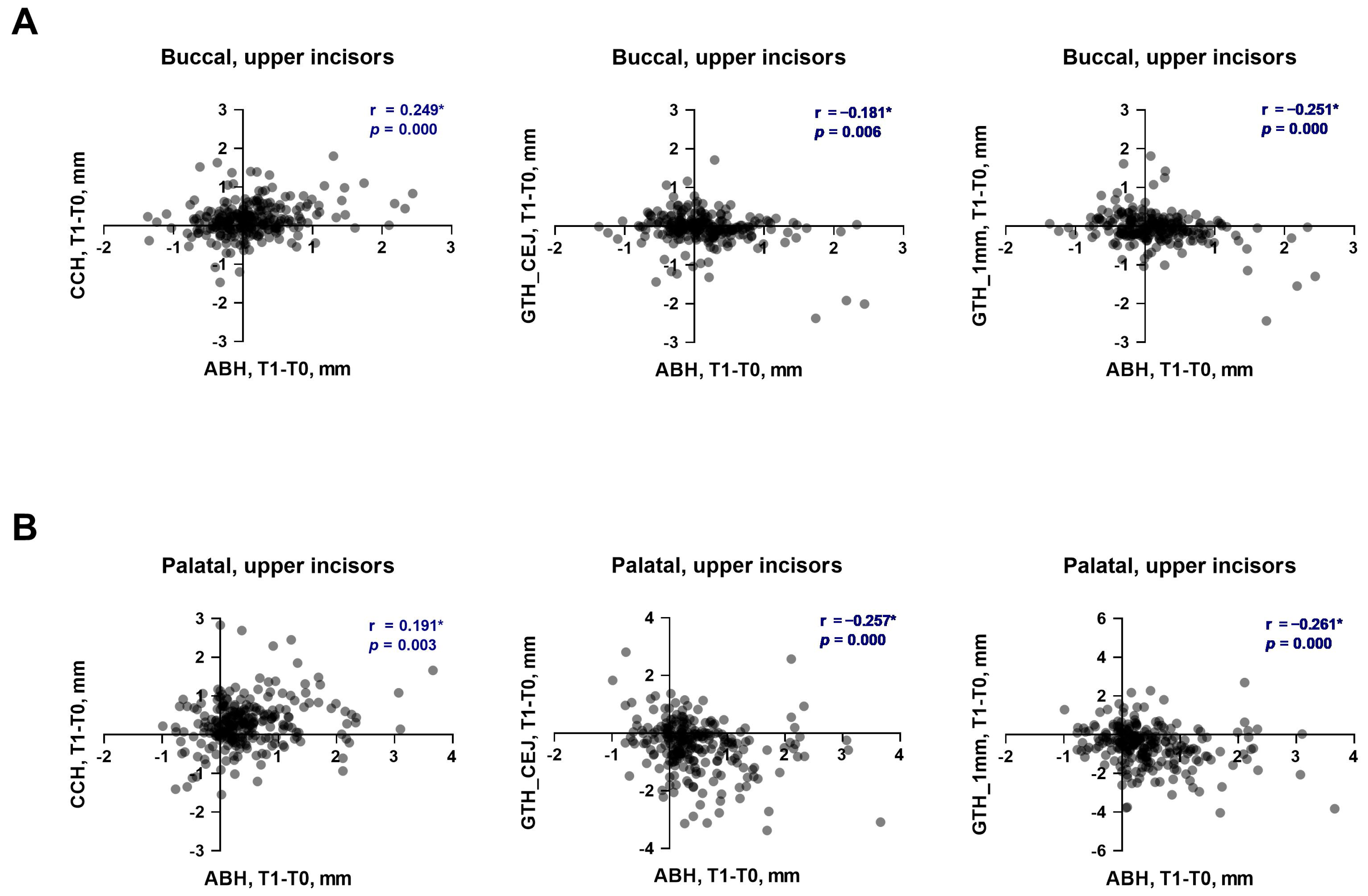 3.3. Relationship Between Changes in Soft Tissue Parameters and Vertical Bone Level During the First Phase of OT
