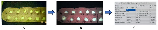 The erosive effects of pediatric syrups on enamel were evaluated using Quantitative Light-Induced Fluorescence (QLF), developed by Inspektor Research Systems BV in Amsterdam, The Netherlands. This device utilizes high-intensity blue light to excite tooth tissue and captures the resulting autofluorescence. Demineralized enamel shows reduced fluorescence compared to healthy enamel. Digital images were taken at baseline (T0) and after exposure (T1). The specialized analysis software quantified the following: lesion area (in mm2) and lesion depth, expressed as the percentage of fluorescence loss (ΔF, %). A more negative ΔF value indicates greater mineral loss, suggesting a more significant erosive effect of the tested syrups (Figure 1).