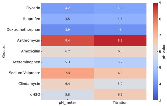 Heatmap of pH values of pediatric syrups measured by pH meter and titration. Colors represent pH values, with blue indicating lower pH and red indicating higher pH levels.