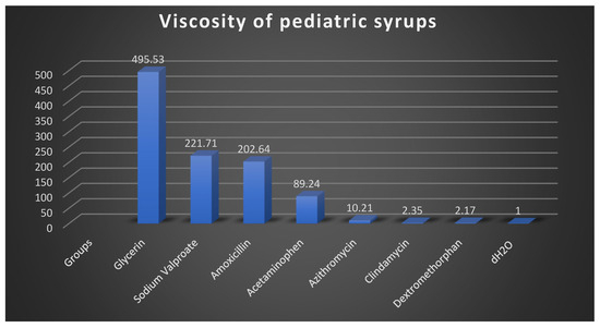 The viscosity values of the pediatric syrups are summarized in Figure 4. Ibuprofen exhibited by far the highest viscosity (76,583.73 mPa·s), although this value should be interpreted with caution, as the measurement required an extended time (≈2 weeks) and may have introduced bias due to the limitations of the Ubbelohde viscometer for highly viscous samples. Among the other formulations, glycerin showed the highest viscosity (495.53 mPa·s), followed by sodium valproate (221.71 mPa·s), amoxicillin (202.64 mPa·s), and acetaminophen (89.24 mPa·s). Azithromycin exhibited a relatively low viscosity (10.21 mPa·s), while dextromethorphan (2.17 mPa·s) and clindamycin (2.35 mPa·s) were close to the control (distilled water, 1 mPa·s).
