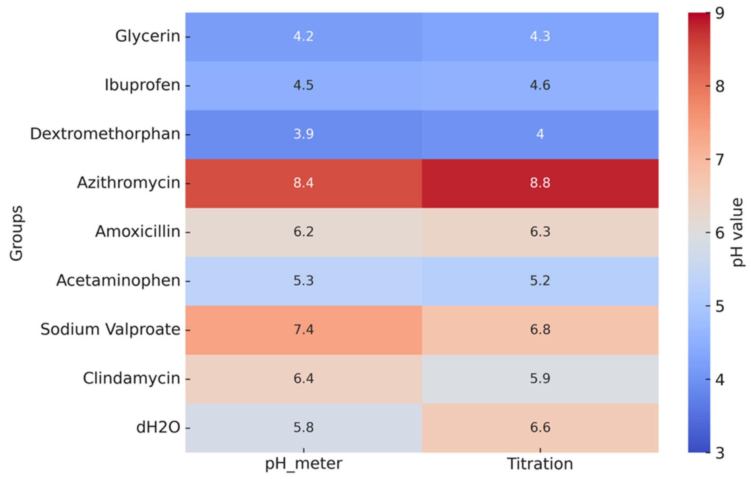 | 3 | Azithromycin (Zithromax 200 mg/5 mL) | Sucrose, trisodium phosphate, xanthan gum, glucose, flavors | 8.44 | 8.82 | 0 | 21.5 | 10.21 | Sucrose, glucose, citric acid traces |