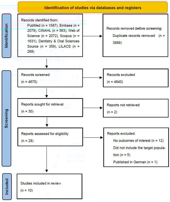 Studies were identified through a comprehensive search of the biomedical literature available in the electronic databases PubMed, Embase, Cumulative Index to Nursing and Allied Health Literature (CINAHL), Web of Science, Scopus, Dentistry & Oral Science Source, and LILACS (Latin American and Caribbean Health Sciences Literature) until 5 January 2025. The Embase search was conducted through the Ovid interface, while CINAHL and Dentistry & Oral Sciences Source searches were conducted through EBSCO. Additionally, references of all included studies were examined to identify additional relevant studies. The systematic review was based solely on searches in previously described databases, without including the grey literature, as this does not undergo a peer review process.
