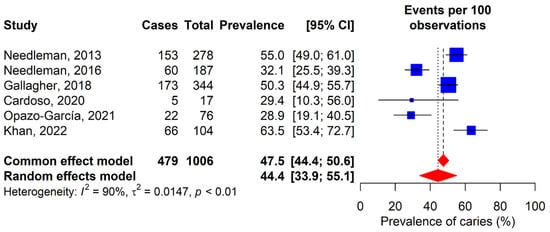 Caries prevalence was reported in six of the included studies [12,30,31,33,35,36], showing considerable variability (Figure 2). The lowest prevalence was 28.9%, observed in the study by Opazo-García et al. [35], while the highest reached 63.5%, according to Khan et al.’s study [36]. After analysis, a combined global prevalence of 44.4% (95% CI: 33.9–55.1%) was determined. Regarding severity, Gay-Escoda et al.’s study reported a DMFT score of 5.7 [11], Kragt et al. DMFT score of 3 [32], Khan et al.’s study reported a DMFT score of 2.7 [36], and De la Parte et al.’s study reported a DMFT score of 8.12 in individual sports athletes and a score of 6.1 in team sports athletes [34].
