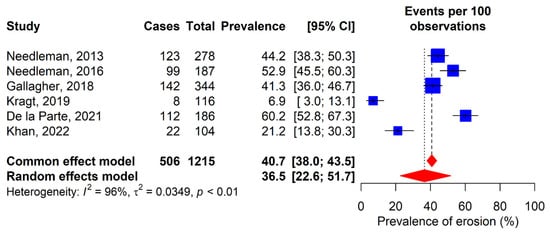 Dental erosion was evaluated in 60% of the included studies [12,30,31,32,34,36]. Prevalences range from 6.9% in Kragt’s study [32] to 60.2% in De la Parte’s study [34]. According to the random-effects model, a combined global prevalence of dental erosion of 36.5% (95% CI: 22.6–51.7%) was determined (Figure 3).