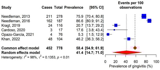 A total of six studies evaluated the prevalence of gingivitis (Figure 4) [12,30,32,33,35,36]. The observed prevalences varied from 5.3% in Opazo-García’s study [35] to 86.6% in Needleman’s study [30]. The prevalence obtained with the random-effects model was 41.4% (95% CI: 14.7–71%). Additionally, Gay-Escoda et al.’s study reported a GI score of 1.1 (SD 0.8) [11].