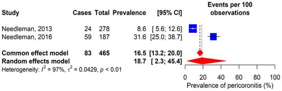 The prevalence of pericoronitis was evaluated in two studies (Figure 5) [12,30]. Results showed variations, with 8.6% in Needleman’s study [12] and 31.6% in Needleman’s study [30]. The combined global prevalence of pericoronitis was 18.7% (95% CI: 2.3–45.4%).