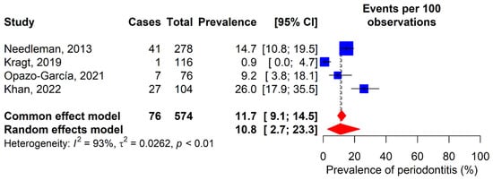 The prevalence of periodontitis was evaluated in four included studies (Figure 6) [12,32,35,36], with ranges varying from 0.9% in Kragt’s study [32] to 26% in Khan’s study [36]. According to the random-effects model, the prevalence was 10.8% (95% CI: 2.7–23.3%). Additionally, Gay-Escoda et al.’s study reported a PPD score of 1.9 [11].