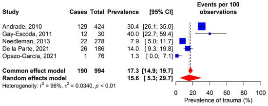 Five studies were included to analyze the prevalence of orofacial trauma in elite athletes (Figure 7) [11,12,29,34,35]. Results varied from 1.3% in Opazo-García’s study (2021) to 40% in Gay-Escoda’s study (2011). One of the studies focused exclusively on football players as the study population [11], while the remaining four included participants from various sports disciplines [12,29,34,35]. The combined global prevalence of orofacial trauma was 15.6% (95% CI: 5.3–29.7%).
