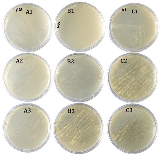 Aliquots (100 µL) of each sample were plated onto Mueller–Hinton agar using a sterile 10 µL loop and streaked in three directions to achieve semi-quantitative isolation. Plates were air-dried for 10 min and then incubated at 35 °C for 18 h. Colony-forming units (CFUs) were enumerated and converted to CFU/cm2 using the following calculation: