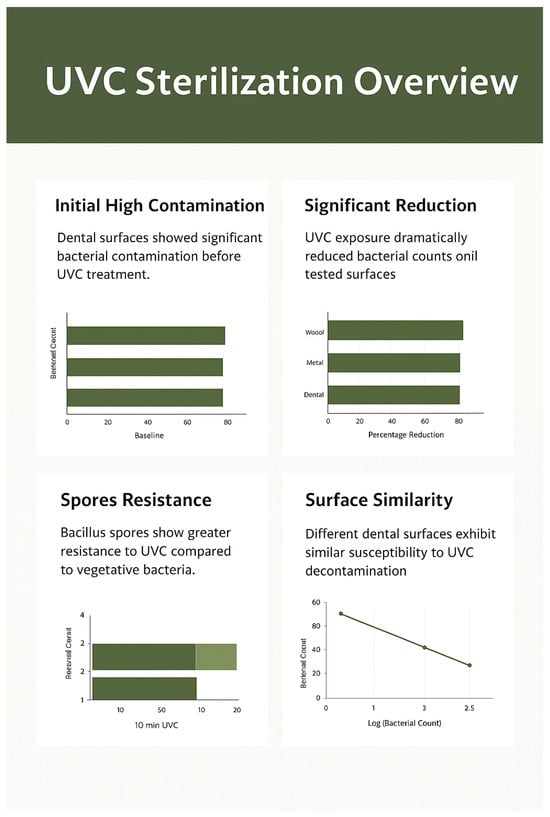 The current study has several limitations that should be considered before translating these findings into clinical practice. First, fungal and viral pathogens were not evaluated; therefore, conclusions are limited to bacterial decontamination. The experimental design—characterized by a small sample size (triplicates), absence of biofilm or heavy-soil models, and limited microbial identification and surface characterization—provides a preliminary framework but does not fully capture the complexity of a dental operatory environment. Although a 5 min UVC exposure shows potential as a safe adjunct surface decontamination measure between patient appointments, further clinical studies are needed to validate its effectiveness under routine practice conditions.