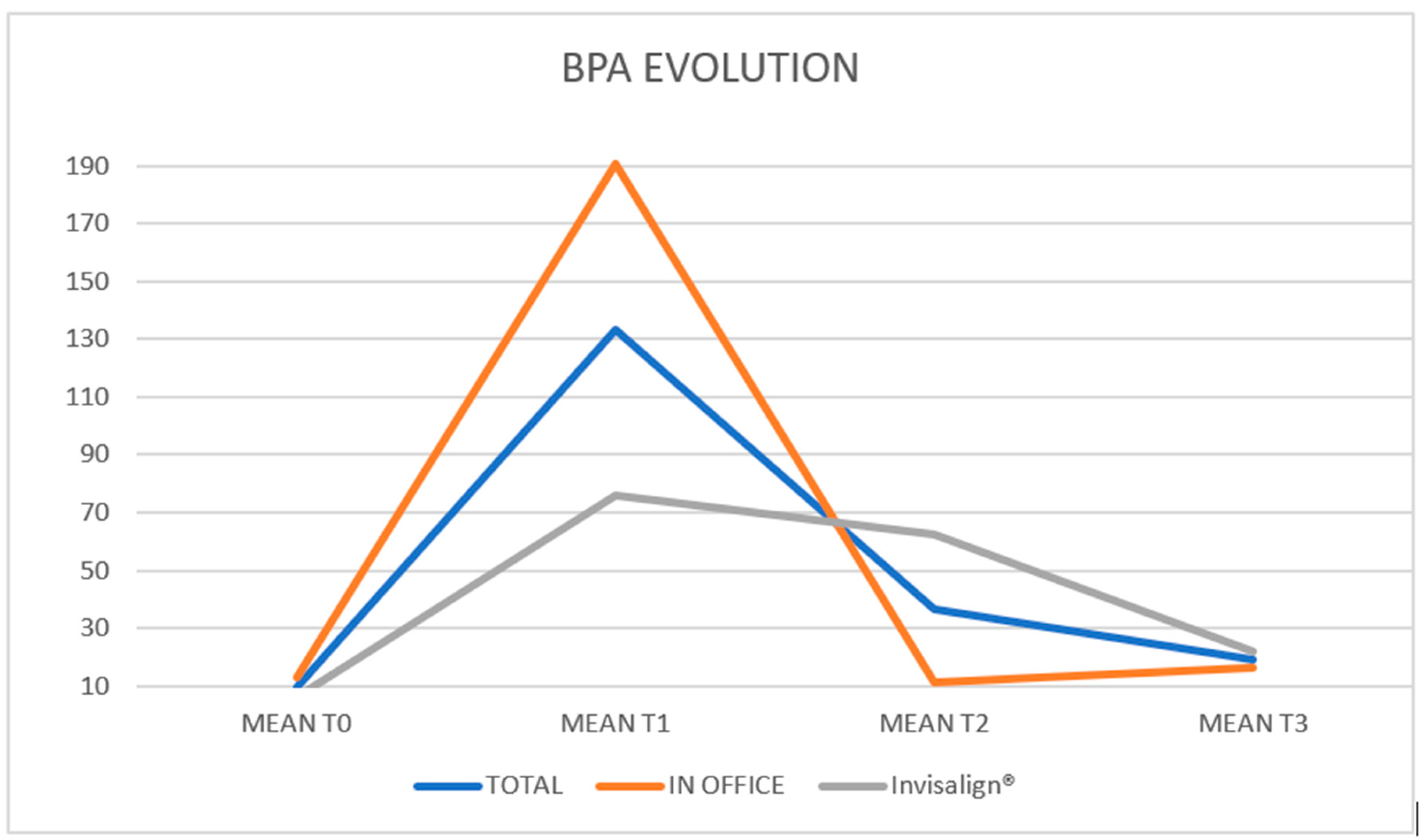 - Overall, BPA changes significantly during the follow-up period (p < 0.001). This variation should be considered similar in both groups (p = 0.545).