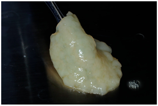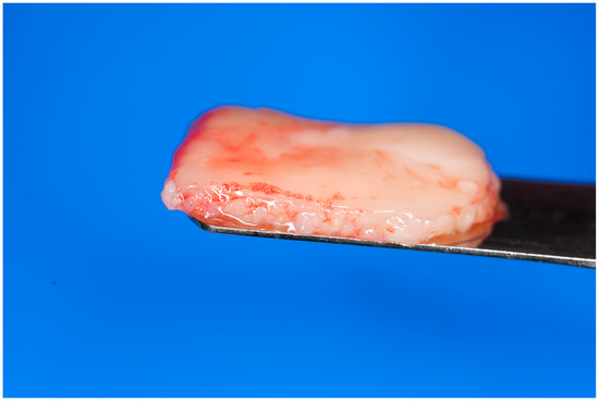 Alternatively, the albumin gel can be pre-mixed with the buffy coat layer of the unheated Liquid-PRF tube, utilizing a female–female luer lock before being deposited in the tray in the desired shape. For this method, the albumin gel is placed in the Bio-Cool (Bio-PRF, Jupiter, FL, USA) at a temperature of 8 degrees Celsius for 2 min prior to mixing with the Liquid-PRF. The final e-PRF membrane is depicted in Figure 2.