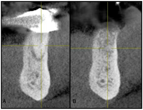(A) Pre-operative CBCT at site #44. (B) Three-month post-operative radiograph of site #44 showing adequate ridge dimensions for implant placement after utilizing an e-PRF membrane over bone allograft particulate.