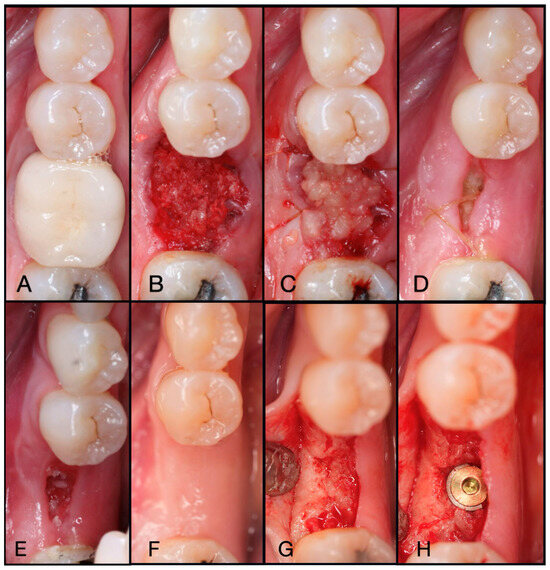 - Fotek, P.D.; Neiva, R.F.; Wang, H.L. Comparison of dermal matrix and polytetrafluoroethylene membrane for socket bone augmentation: A clinical and histologic study. J. Periodontol. 2009, 80, 776–785. [Google Scholar] [CrossRef] [PubMed]