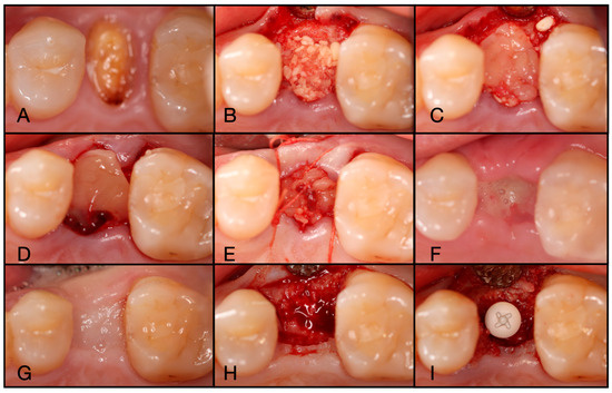 (A) Pre-operative clinical photograph of tooth #25, which presented a fractured crown to the gingival margin. (B) After atraumatic extraction of tooth #25, the socket was degranulated with a spoon excavator and packed with “Sticky bone” created by mixing both Solid- and Liquid-PRF with particulate bone allograft. (C) An e-PRF membrane was placed, followed by a (D) Solid-PRF membrane overtop. (E) 4-0 Vicryl sutures were utilized in a criss-cross fashion to secure the dual-layered membrane in place. (F) The patient was brought back for a two-week post-operative evaluation, displaying incomplete wound closure. (G) Nevertheless, tissue maturation was observed before implant placement at 3 months post-extraction. (H) Full-thickness flaps were reflected to display adequate bone volume. (I) The implant was then placed uneventfully.