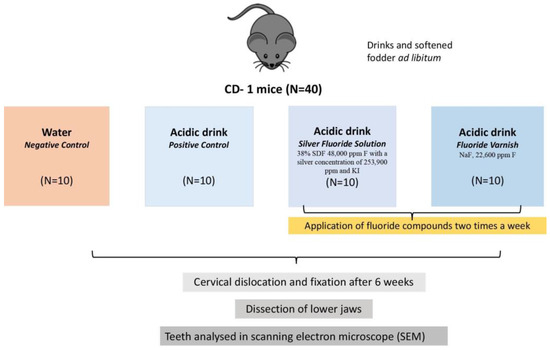 A flowchart of the study animal’s enrollment. A total of 40 mice were assigned to four experimental groups. Three groups were given an acidic beverage (Coca Cola, phosphoric acid, pH = 2.27), while the fourth group served as a negative control, receiving distilled water. Of the three experimental groups, two were treated with topical agents applied to the molar teeth: one group received a silver fluoride solution containing silver diamine fluoride (38% SDF, 48,000 ppm F, 253,900 ppm silver) followed by potassium iodide (KI) and the second group received fluoride varnish (NaF, 22,600 ppm F). After six weeks, all animals were euthanized via cervical dislocation, and their teeth were prepared for SEM analysis.